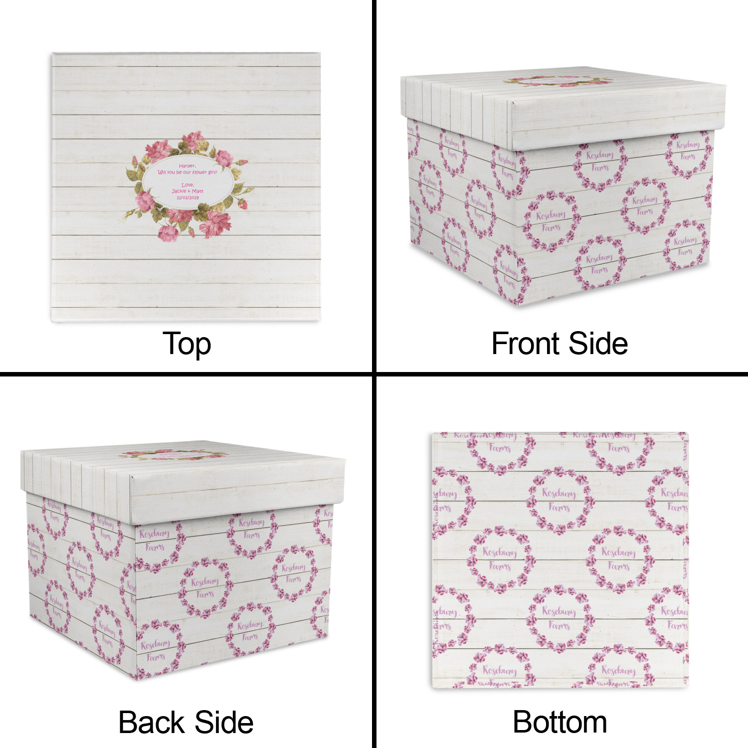 The main design has a background of weathered wooden planks. A beautiful light pink flower frame is used as the focal point of this design. The pink color of the frame and the personalization inside is the perfect contrast to the light colored wood.