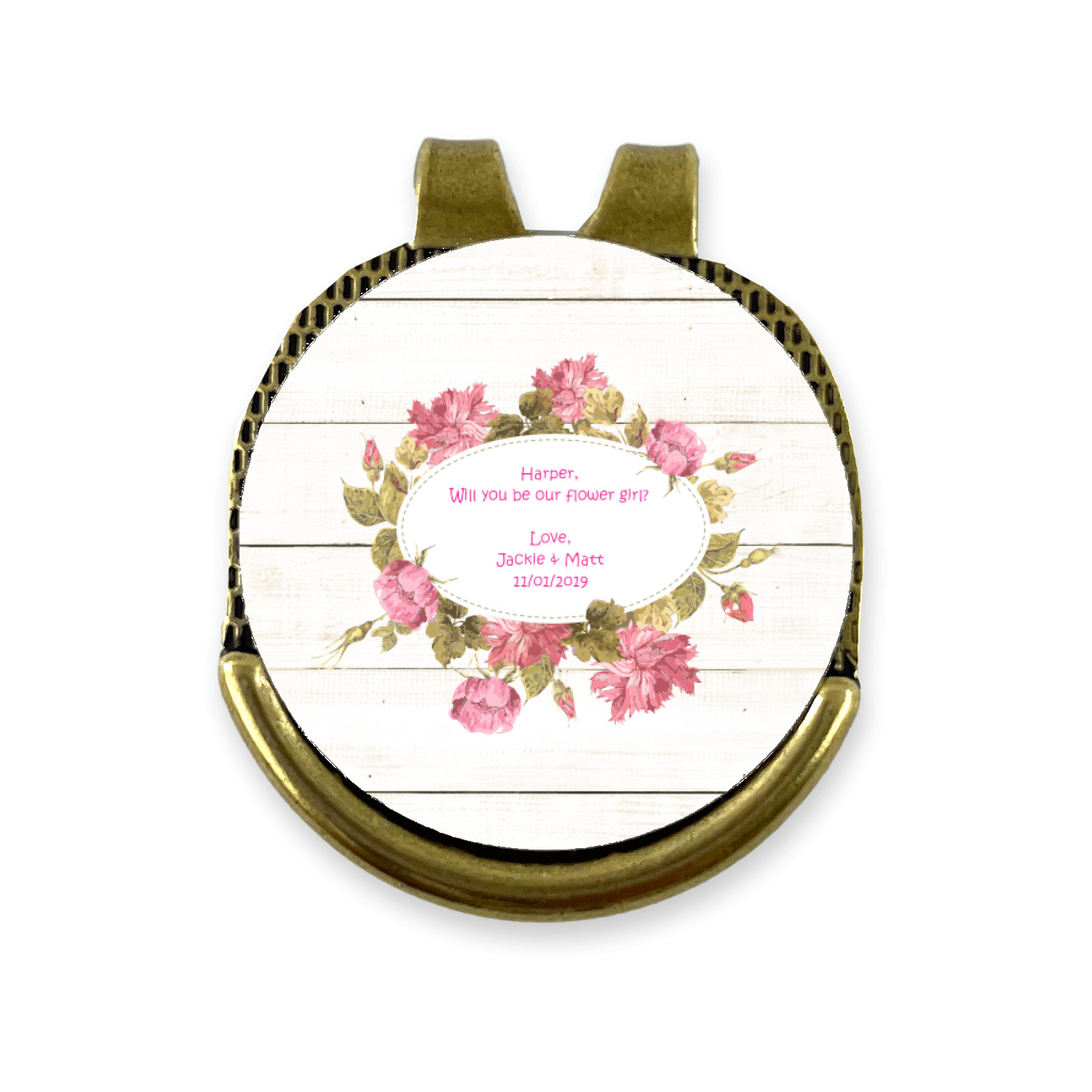 The main design has a background of weathered wooden planks. A beautiful light pink flower frame is used as the focal point of this design. The pink color of the frame and the personalization inside is the perfect contrast to the light colored wood.