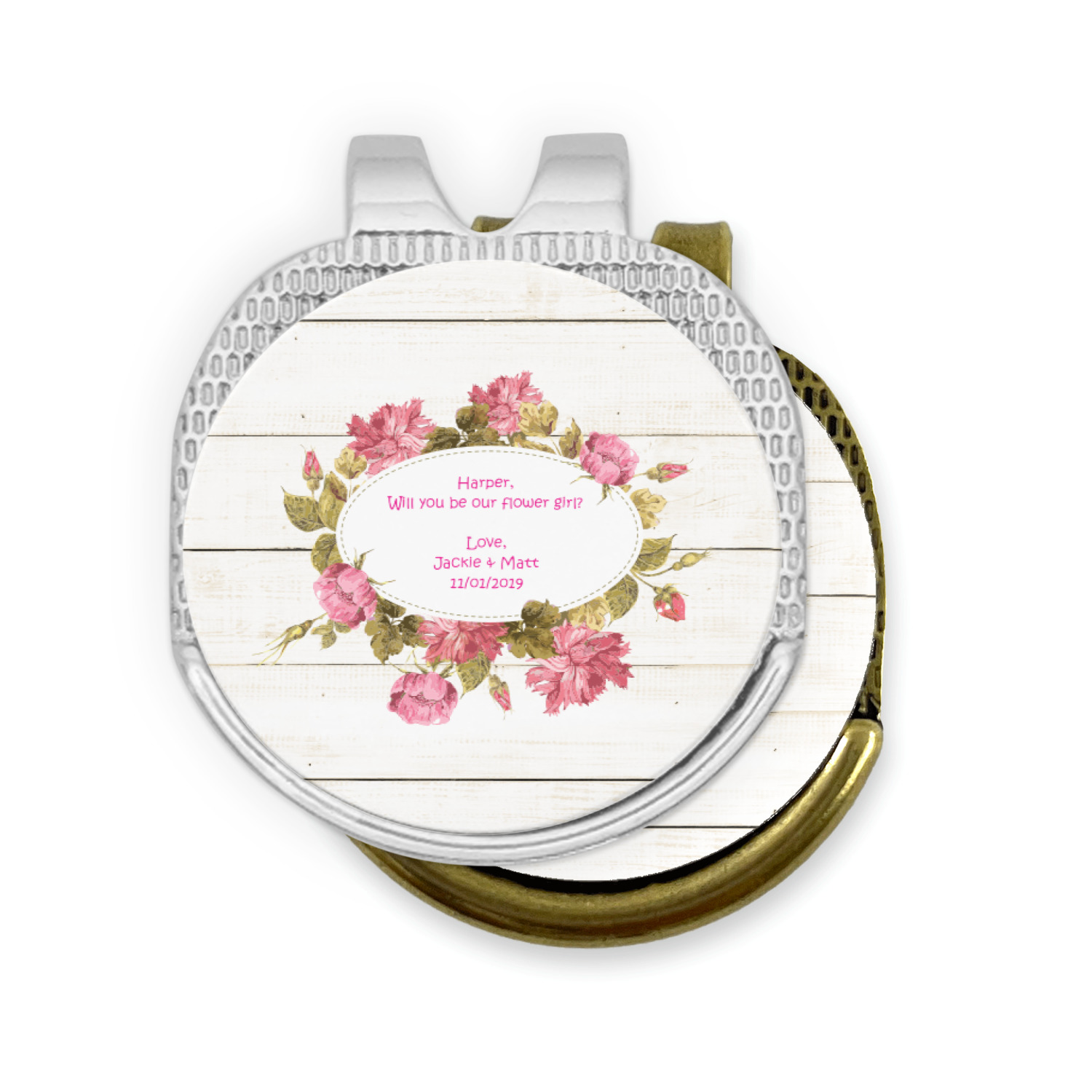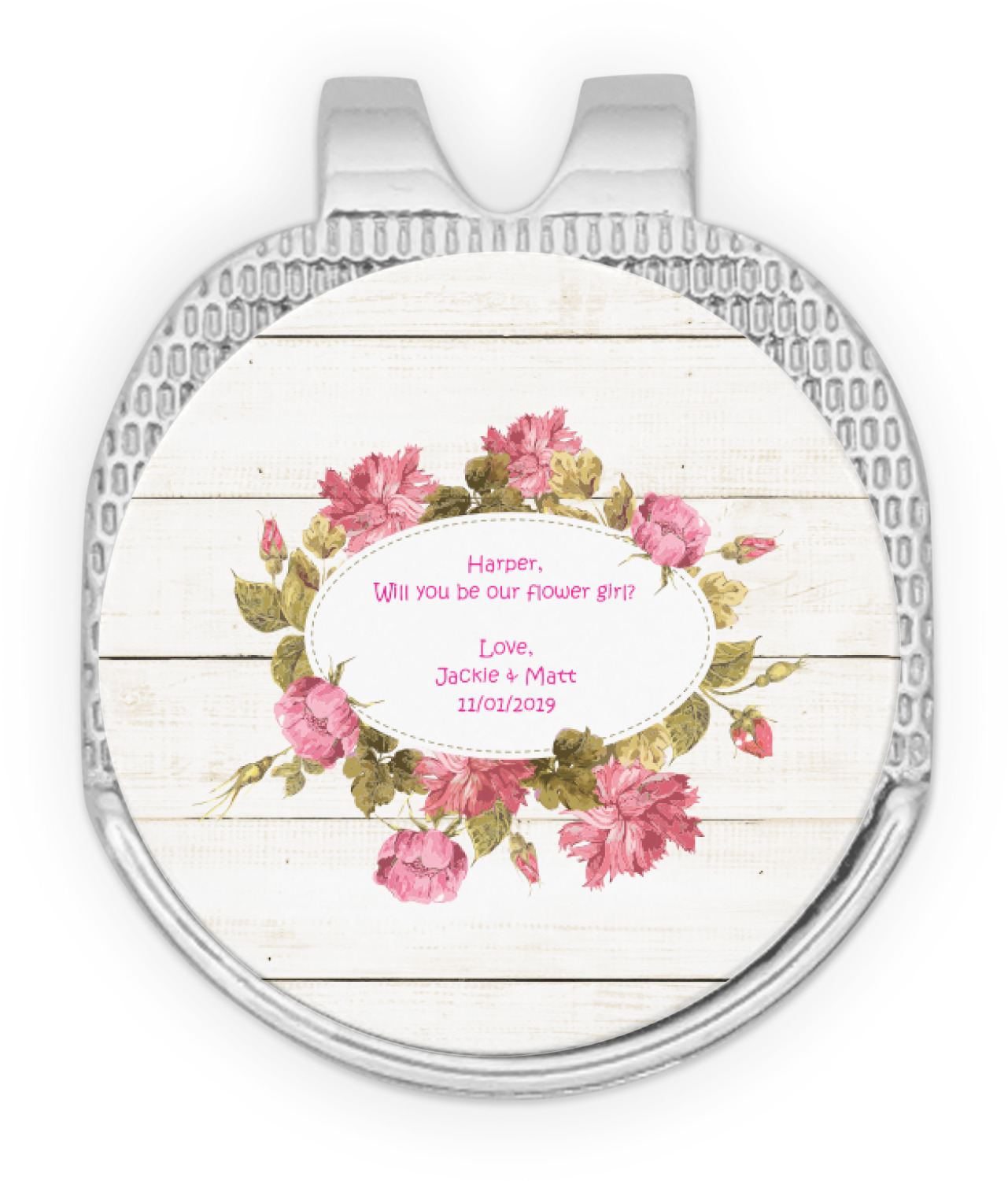 The main design has a background of weathered wooden planks. A beautiful light pink flower frame is used as the focal point of this design. The pink color of the frame and the personalization inside is the perfect contrast to the light colored wood.
