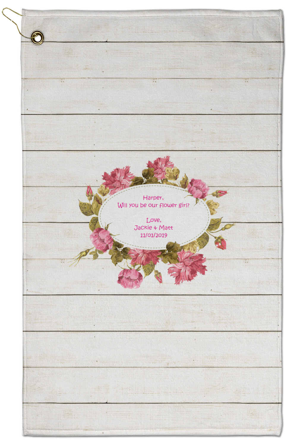 The main design has a background of weathered wooden planks. A beautiful light pink flower frame is used as the focal point of this design. The pink color of the frame and the personalization inside is the perfect contrast to the light colored wood.