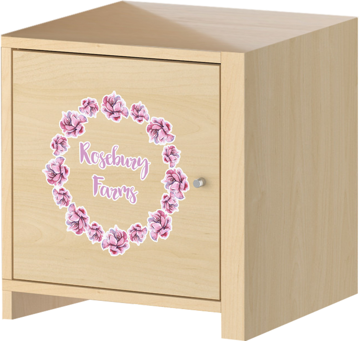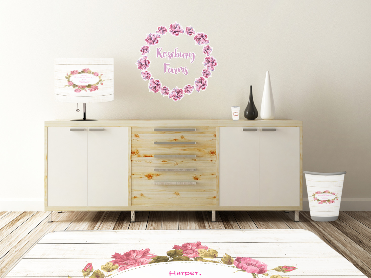 The main design has a background of weathered wooden planks. A beautiful light pink flower frame is used as the focal point of this design. The pink color of the frame and the personalization inside is the perfect contrast to the light colored wood.