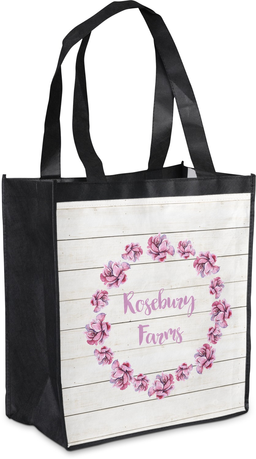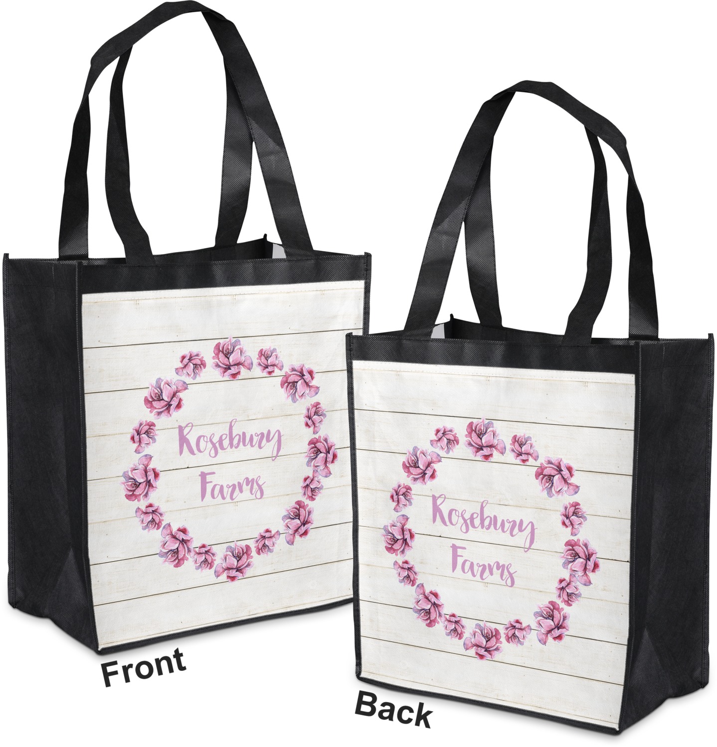 Made from a durable, biodegradable material, these reusable shopping bags can support up to 30 pounds of weight. With two large handles, measuring at 8.5 inches each, these personalized tote bags are easy to carry to your vehicle or home. The bag itself is 12 by 13.5 inches, and can expand to a depth of 7 inches. Your customization is printed on both the front and back, while the remaining sides, trim, and handle are a sleek, charcoal black.