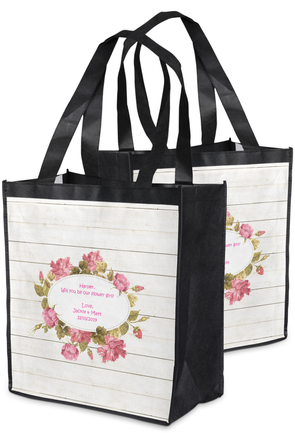 Made from a durable, biodegradable material, these reusable shopping bags can support up to 30 pounds of weight. With two large handles, measuring at 8.5 inches each, these personalized tote bags are easy to carry to your vehicle or home. The bag itself is 12 by 13.5 inches, and can expand to a depth of 7 inches. Your customization is printed on both the front and back, while the remaining sides, trim, and handle are a sleek, charcoal black.