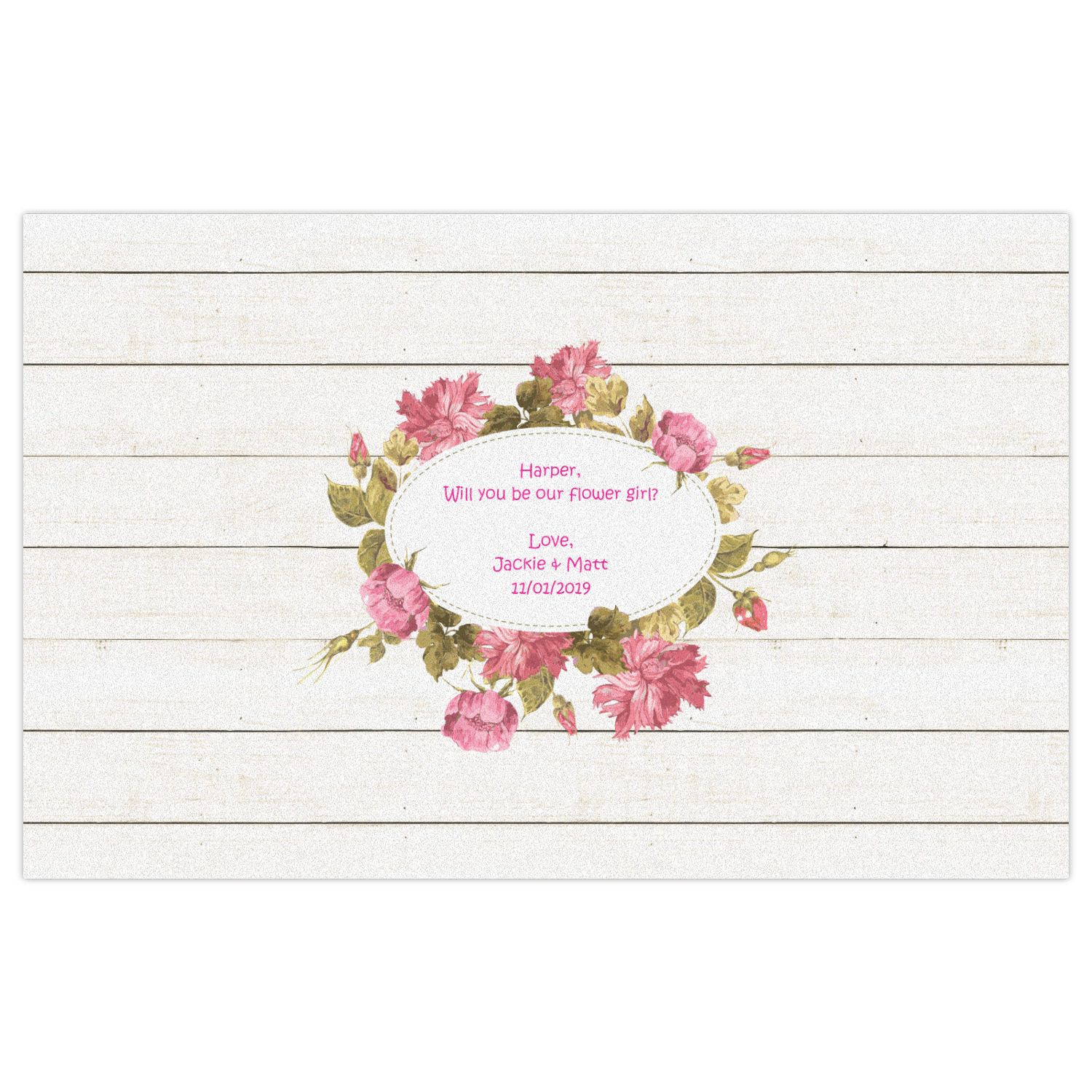 The main design has a background of weathered wooden planks. A beautiful light pink flower frame is used as the focal point of this design. The pink color of the frame and the personalization inside is the perfect contrast to the light colored wood.