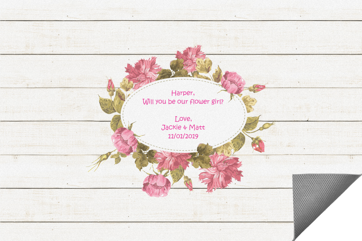 The main design has a background of weathered wooden planks. A beautiful light pink flower frame is used as the focal point of this design. The pink color of the frame and the personalization inside is the perfect contrast to the light colored wood.