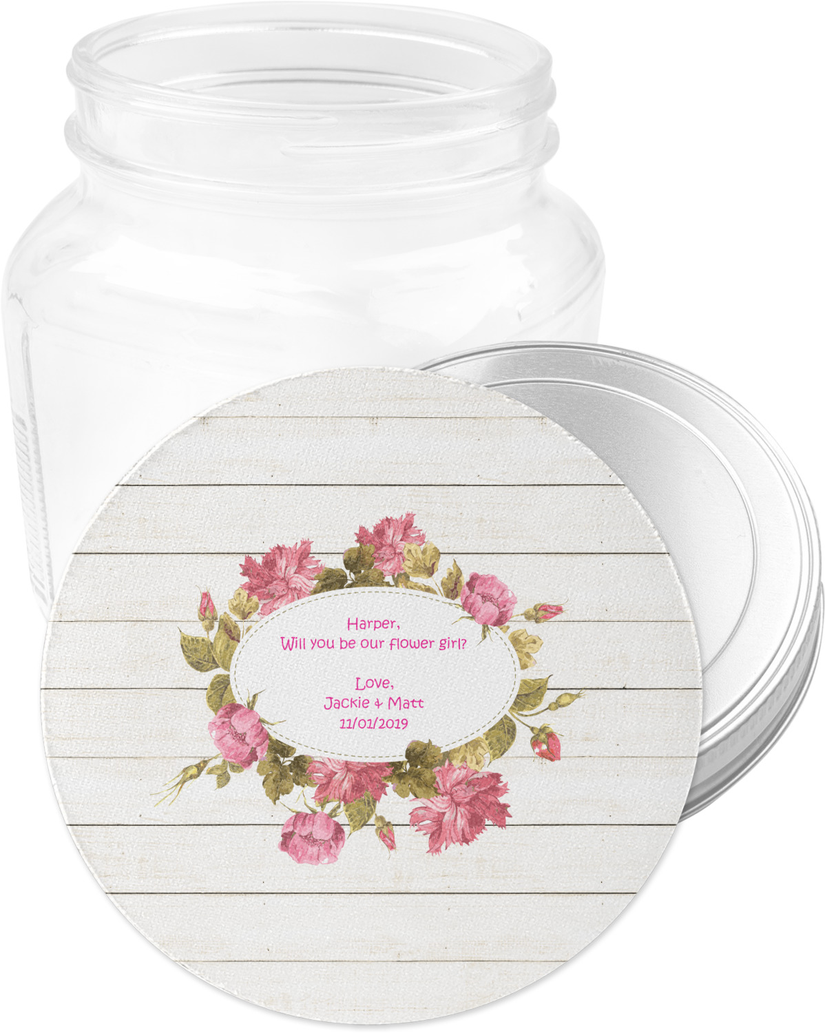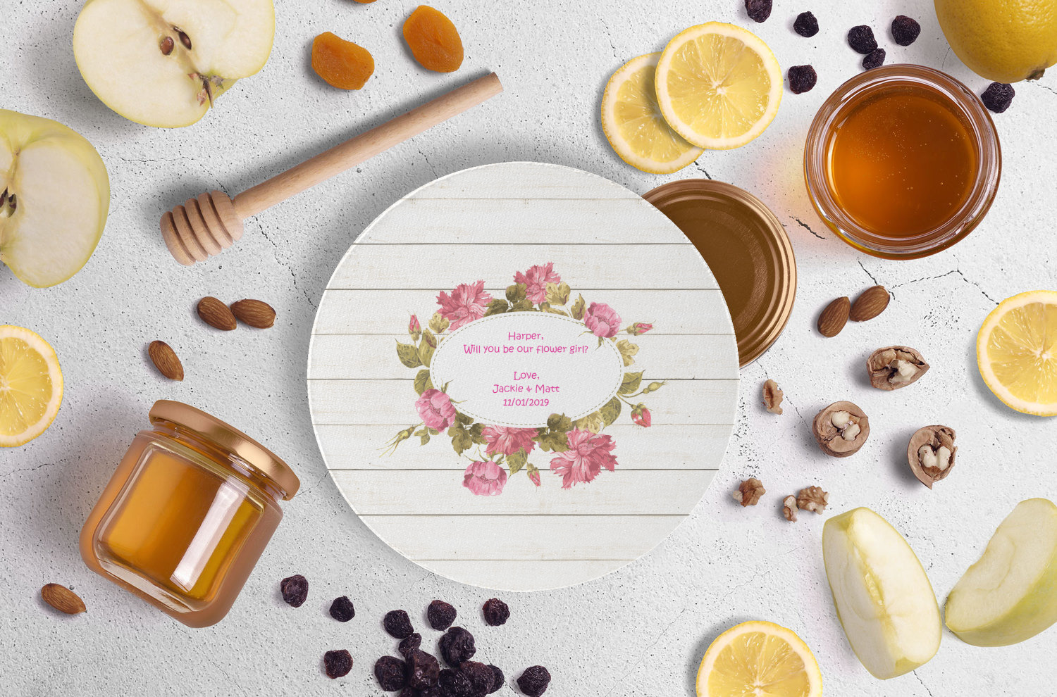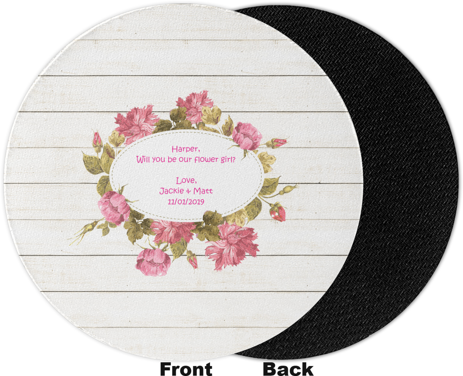 The main design has a background of weathered wooden planks. A beautiful light pink flower frame is used as the focal point of this design. The pink color of the frame and the personalization inside is the perfect contrast to the light colored wood.