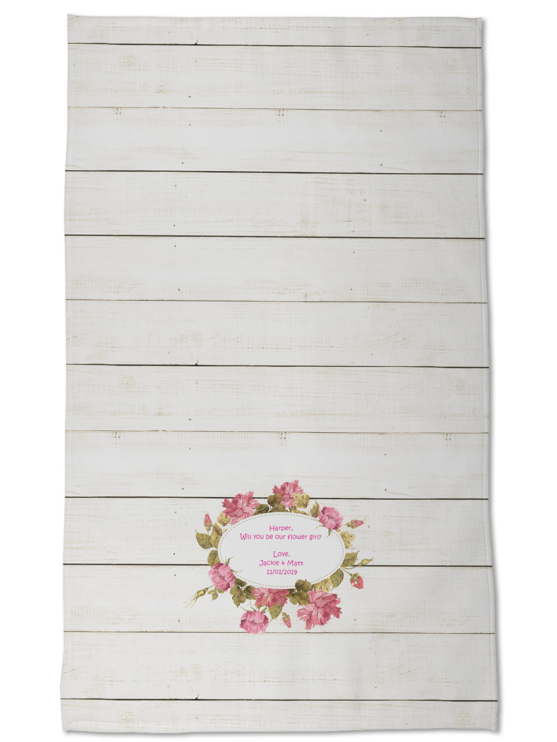 The main design has a background of weathered wooden planks. A beautiful light pink flower frame is used as the focal point of this design. The pink color of the frame and the personalization inside is the perfect contrast to the light colored wood.