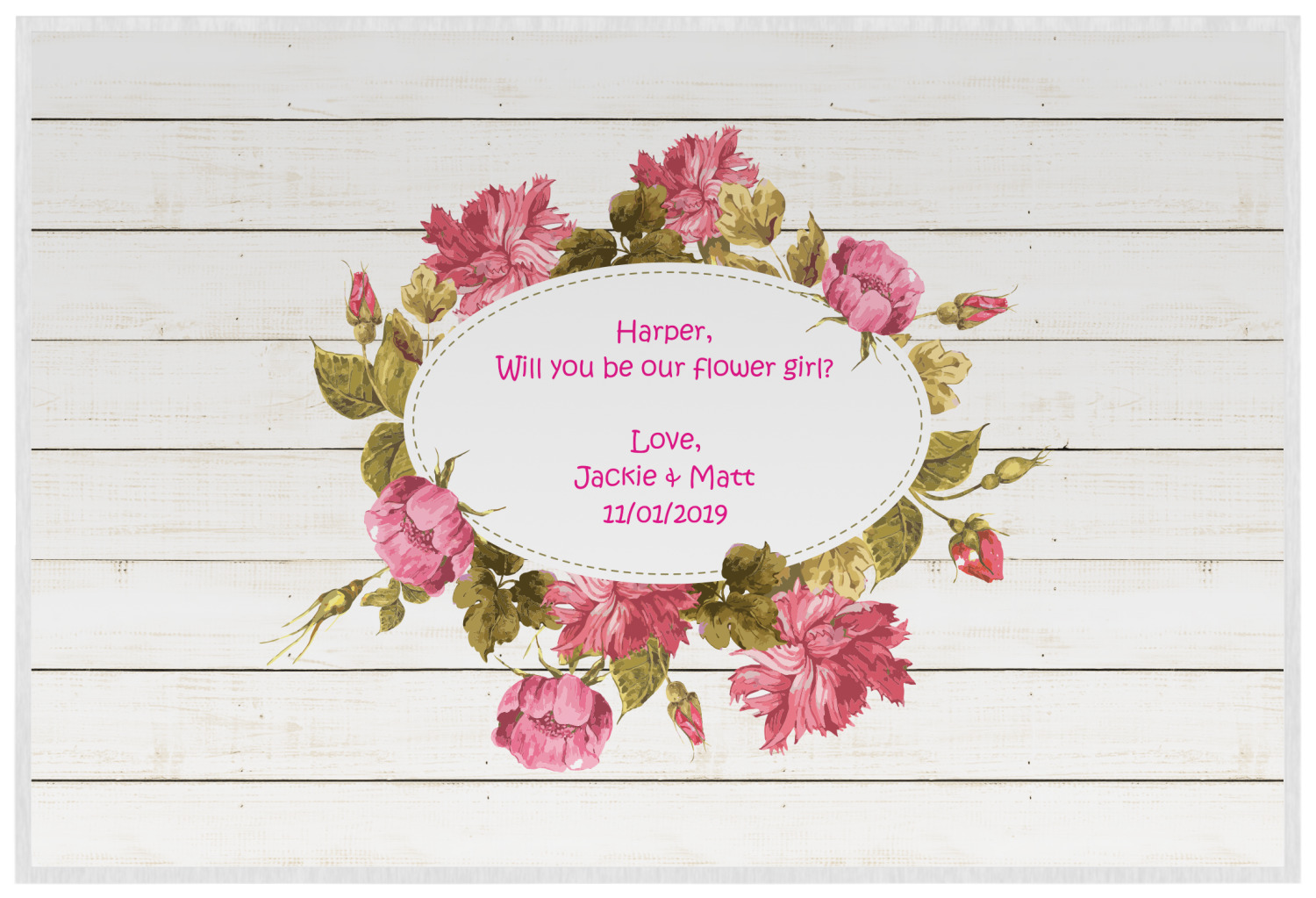 The main design has a background of weathered wooden planks. A beautiful light pink flower frame is used as the focal point of this design. The pink color of the frame and the personalization inside is the perfect contrast to the light colored wood.