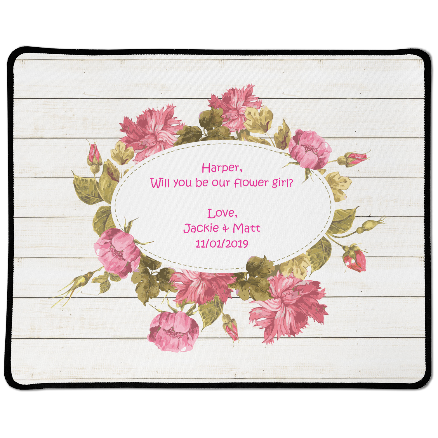 The main design has a background of weathered wooden planks. A beautiful light pink flower frame is used as the focal point of this design. The pink color of the frame and the personalization inside is the perfect contrast to the light colored wood.