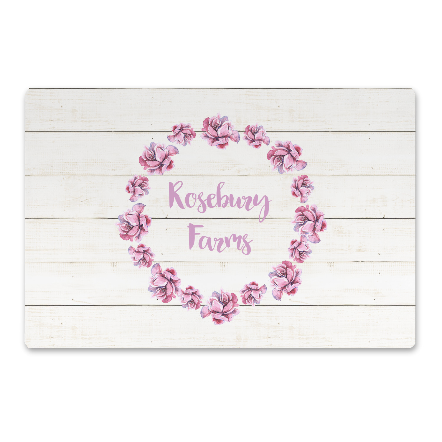 The main design has a background of weathered wooden planks. A beautiful light pink flower frame is used as the focal point of this design. The pink color of the frame and the personalization inside is the perfect contrast to the light colored wood.