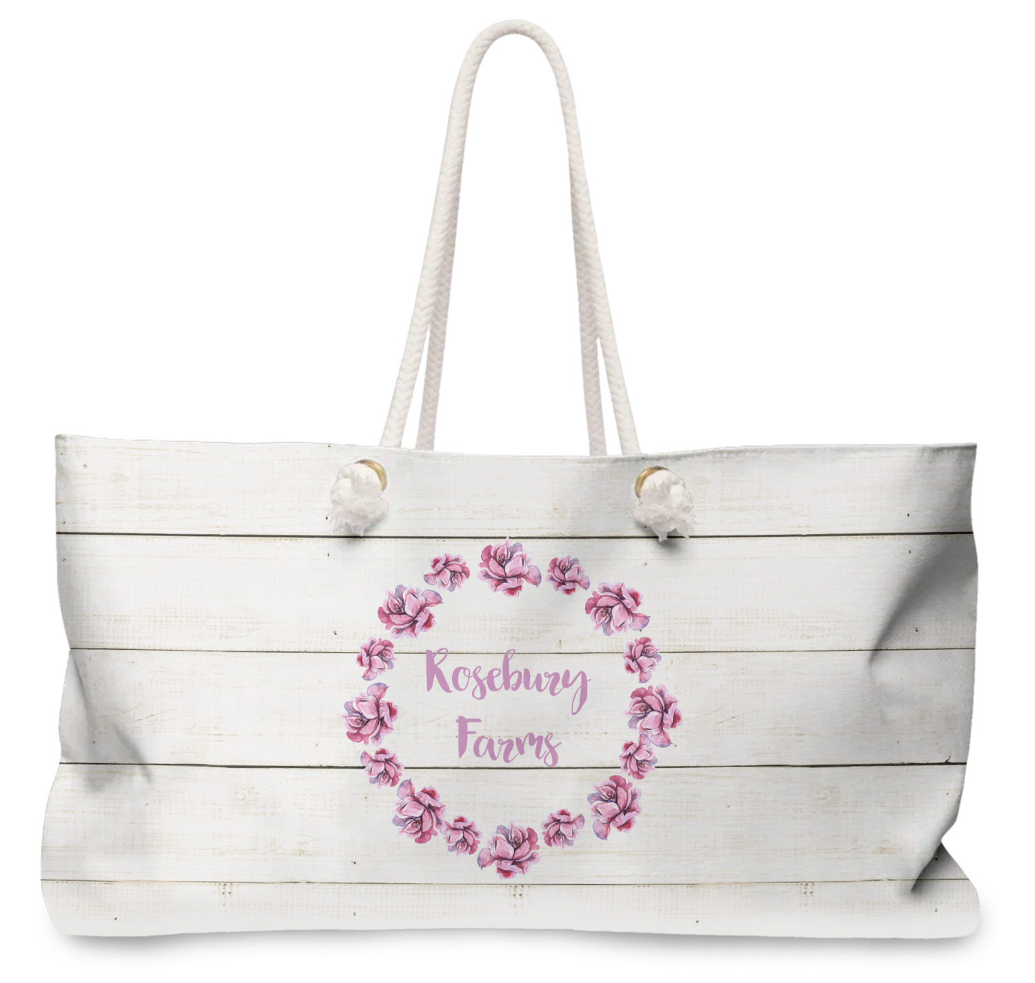 Our oversized weekender tote with rope handles is perfect for your weekend at the beach or on the town. This large tote are 24" W X 13" H, with a 5" gusset and a 27" thick rope handles with a knot that is put through a grommeted brass hole.