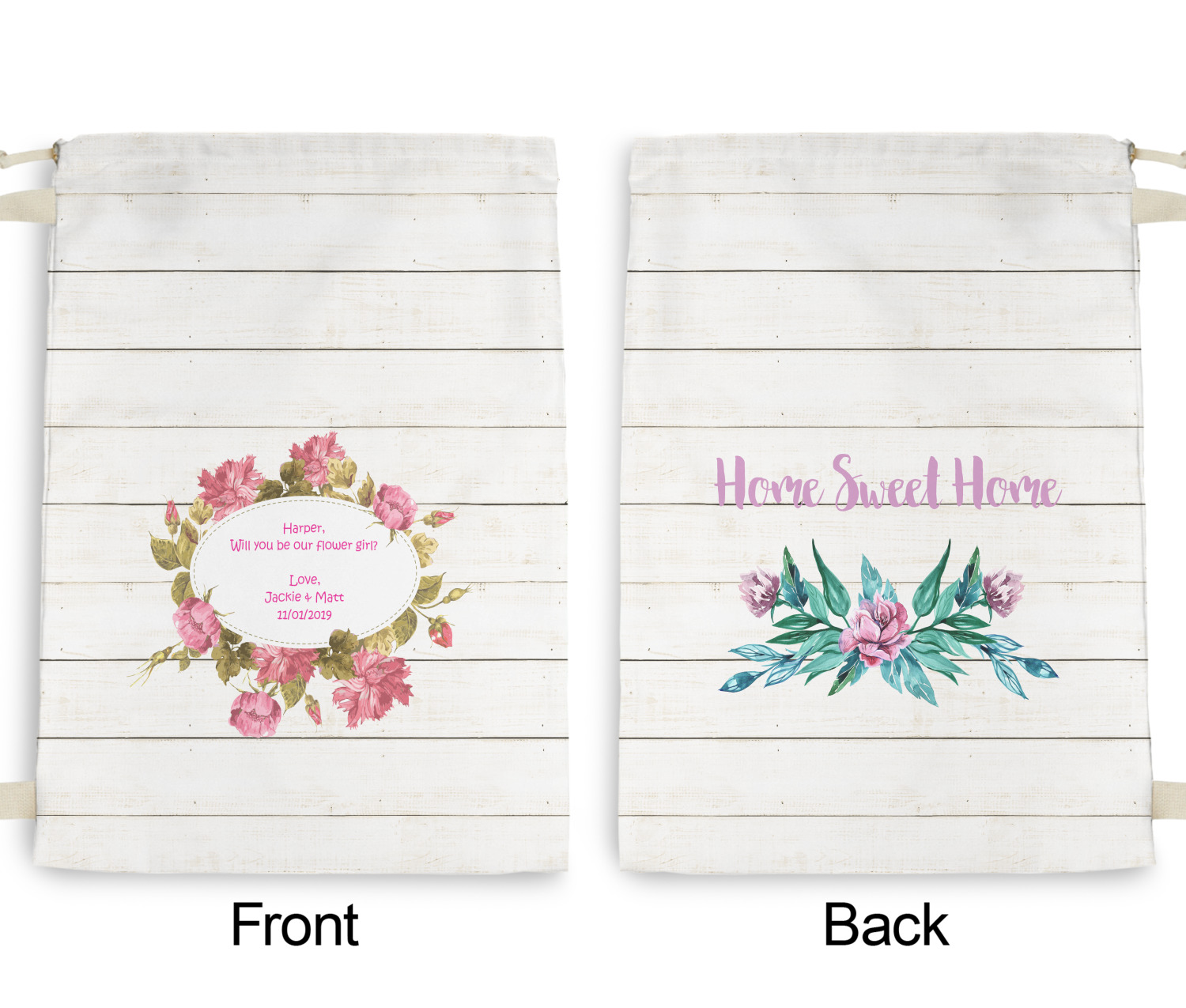 Carry your laundry in style with these customized laundry bags. Available in two sizes, featuring a natural colored woven strap and a cinch cord, these bags hold a lot of clothes or anything else you want to fit in them.