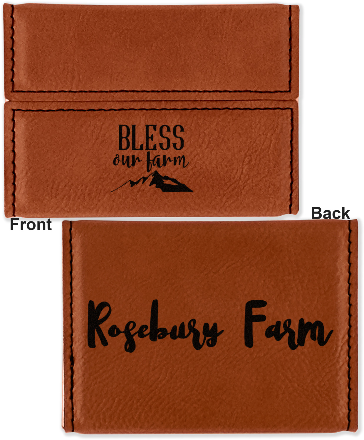 Your personalized design is laser engraved onto either the front, or the front and back of the card holder, depending on the model you purchase. Once engraved, the design will appear a darkened black against the cognac color of the leatherette.
