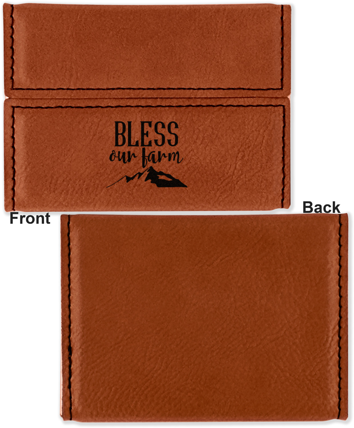 Your personalized design is laser engraved onto either the front, or the front and back of the card holder, depending on the model you purchase. Once engraved, the design will appear a darkened black against the cognac color of the leatherette.