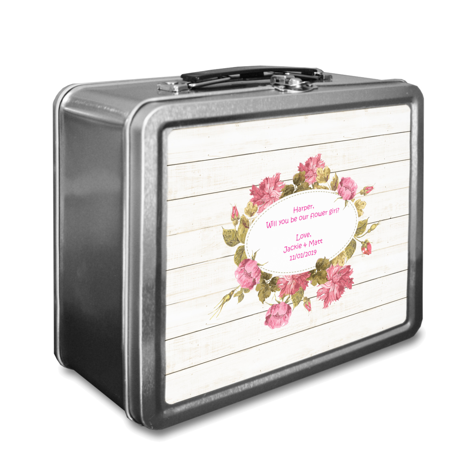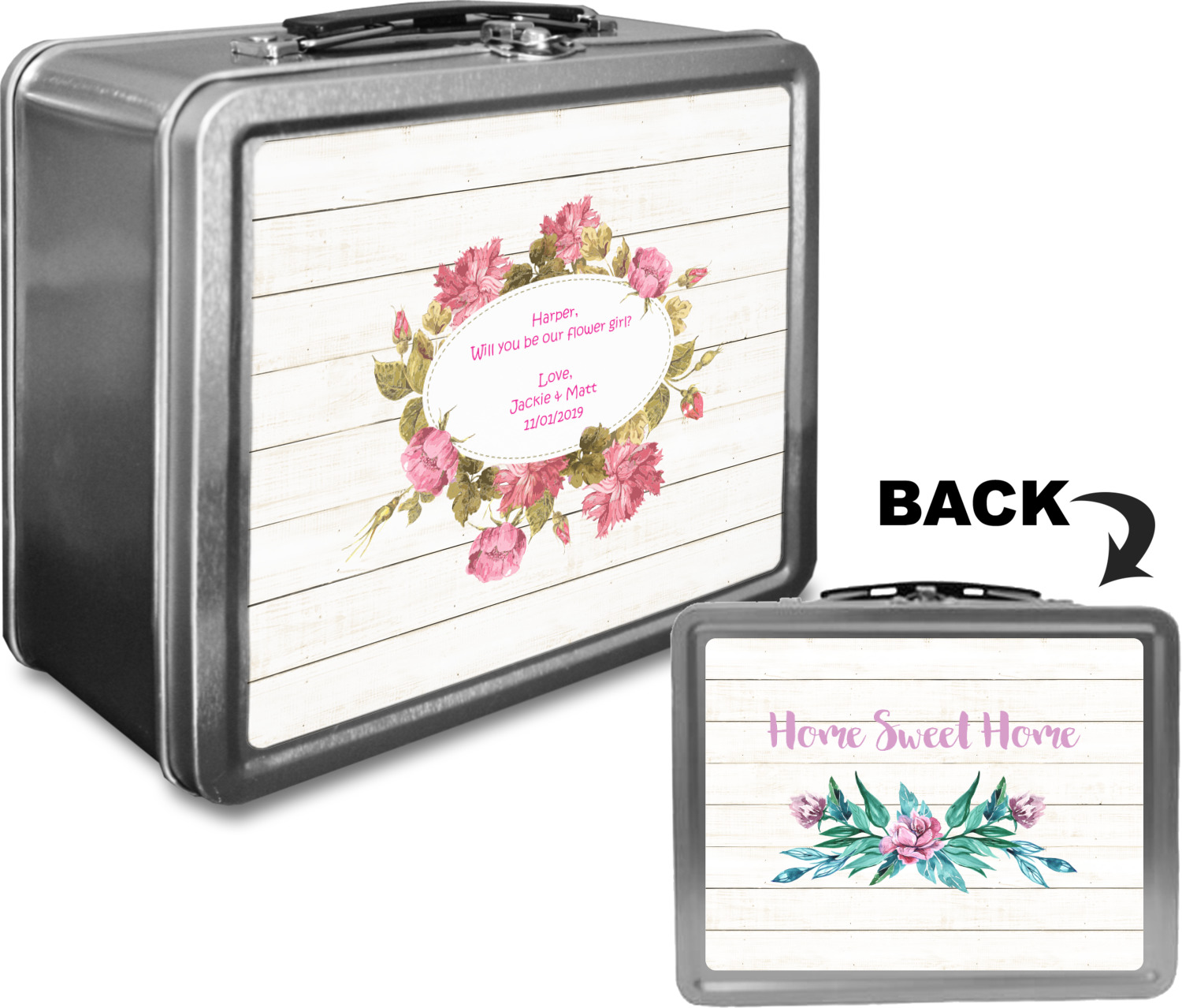 When customized, these boxes can also serve as a unique keepsake box! We print your design on both the front and back of this box, using a high quality matte vinyl, with waterproof inks that withstand the test of time. The designs are then machine cut, and adhered to the sides of the metal lunch container.
