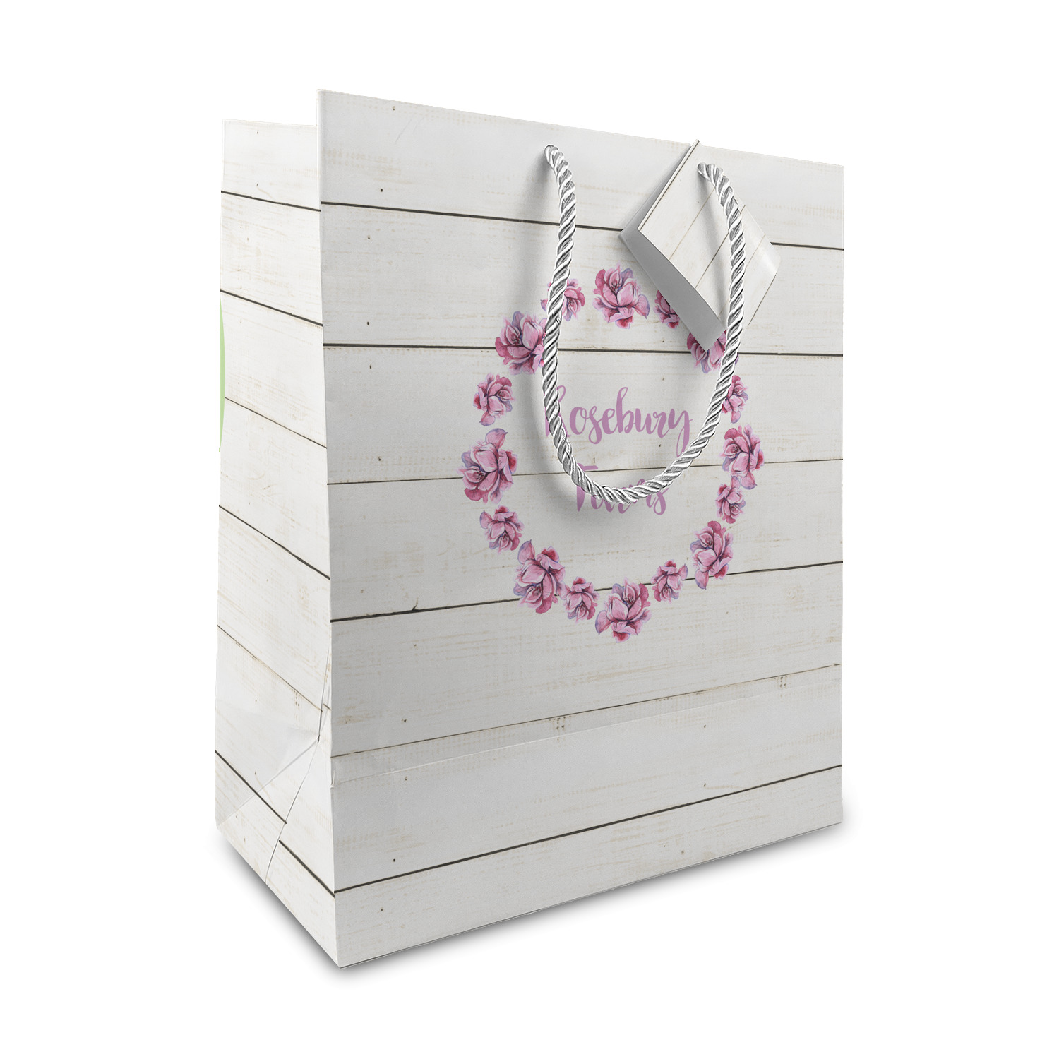 Our gift bags are digitally printed in full color on a premium heavy weight paper. The bags are then cut, scored & folded. The silver rope handles are then attached to the gift bag, along with the gift card.