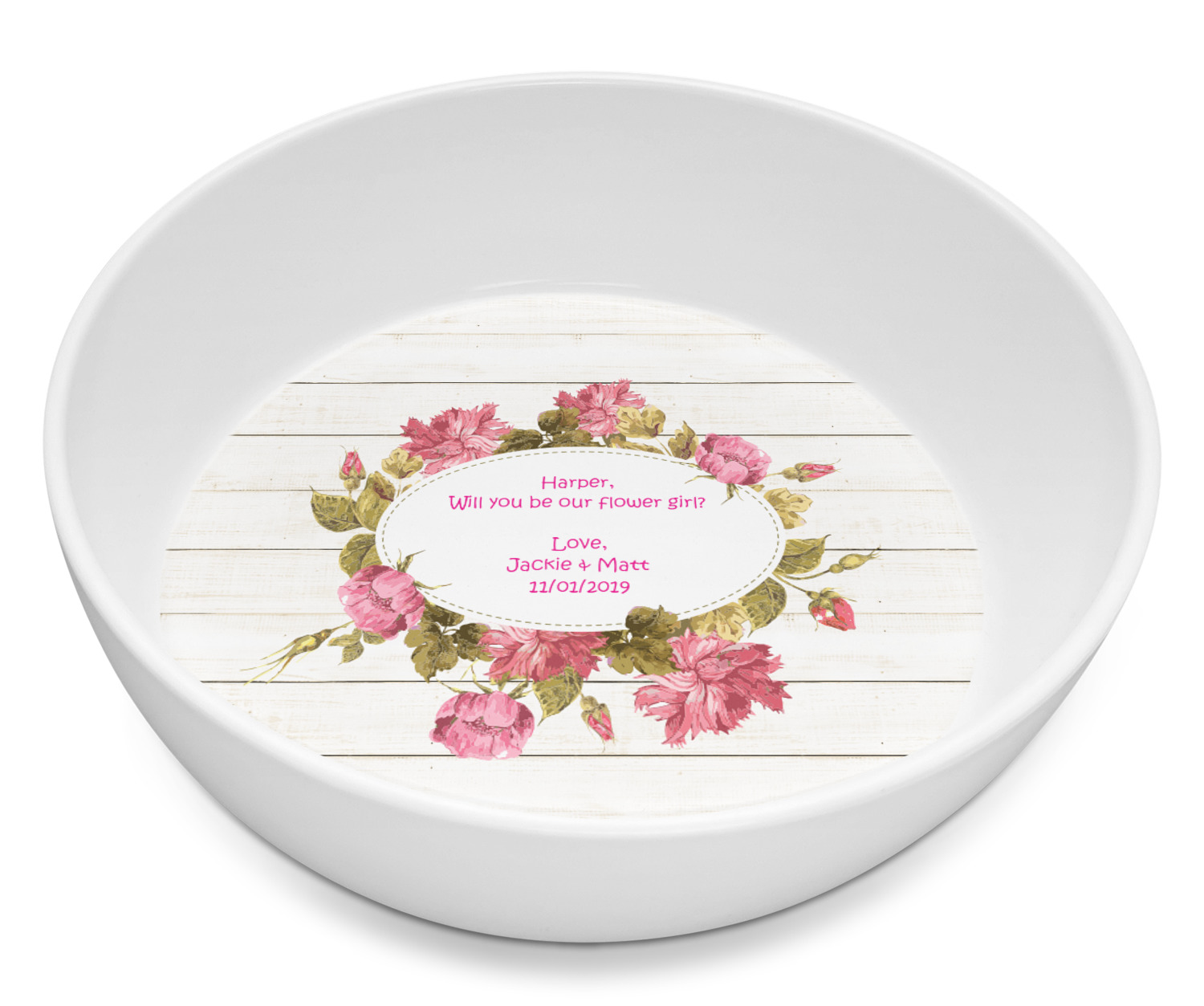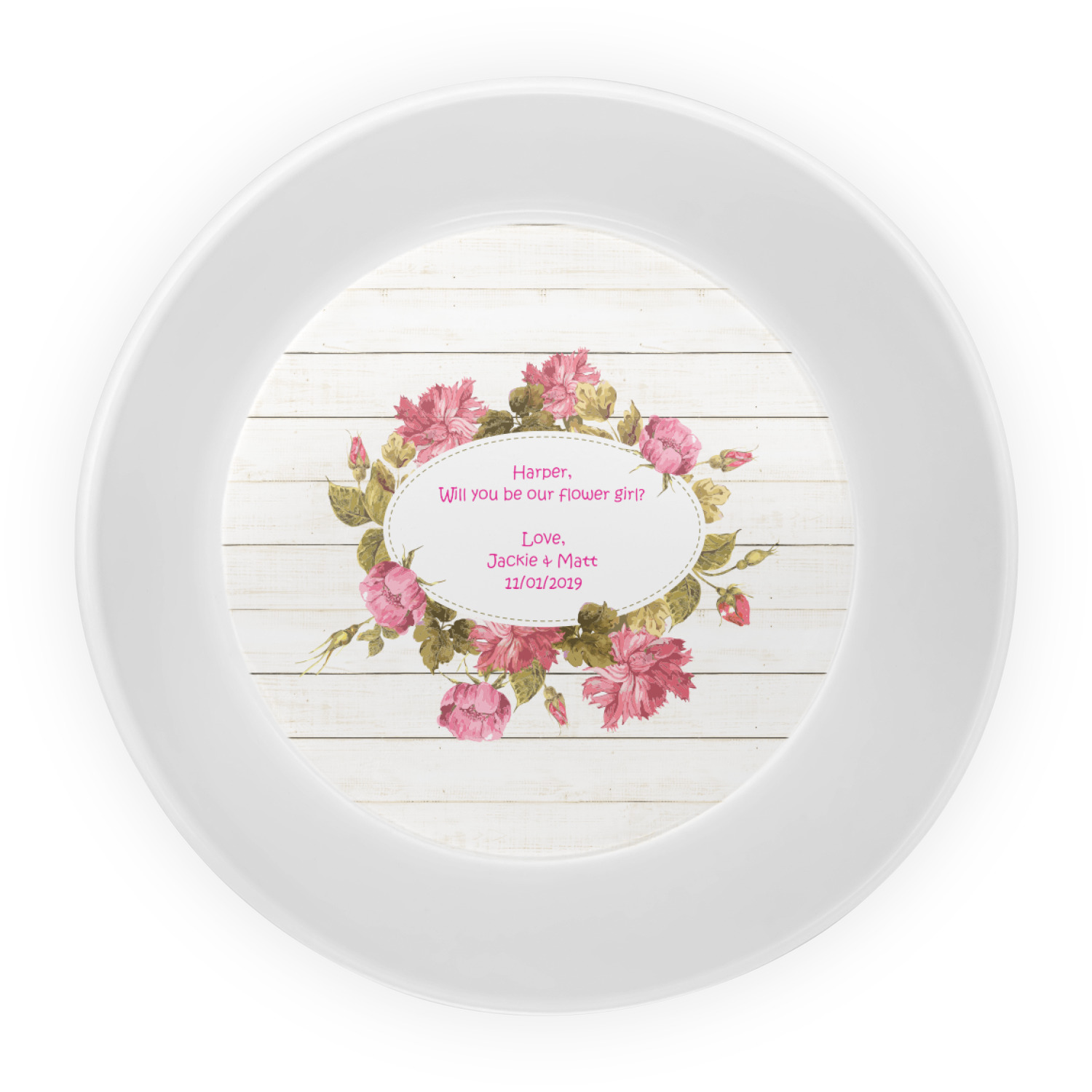 The main design has a background of weathered wooden planks. A beautiful light pink flower frame is used as the focal point of this design. The pink color of the frame and the personalization inside is the perfect contrast to the light colored wood.