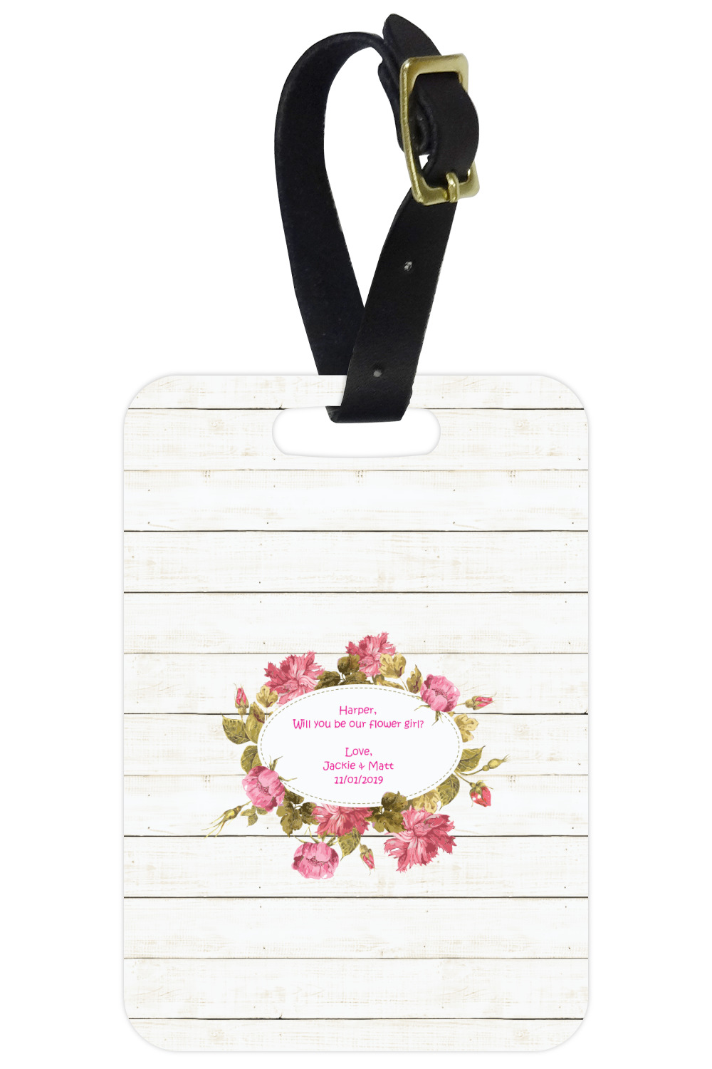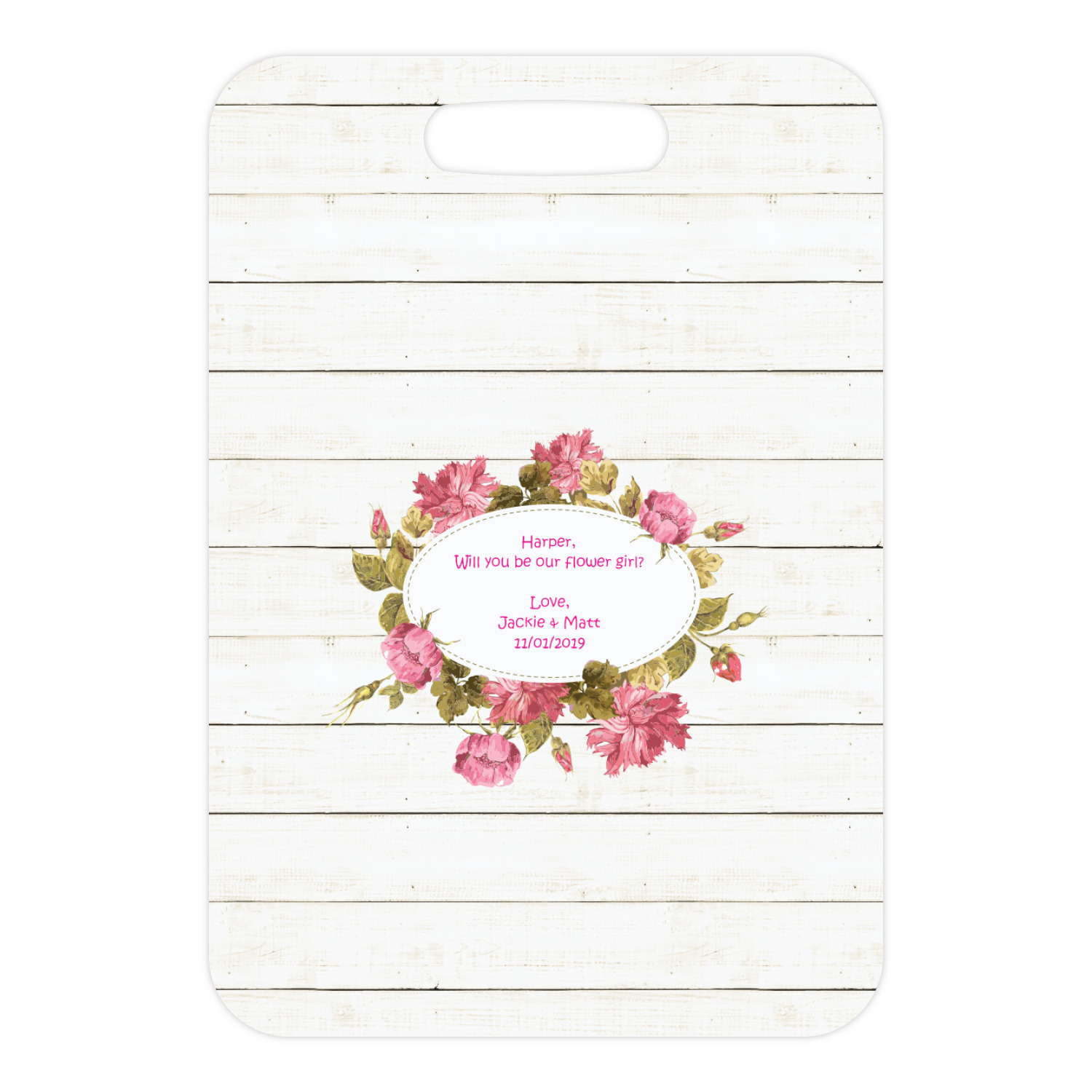 The main design has a background of weathered wooden planks. A beautiful light pink flower frame is used as the focal point of this design. The pink color of the frame and the personalization inside is the perfect contrast to the light colored wood.
