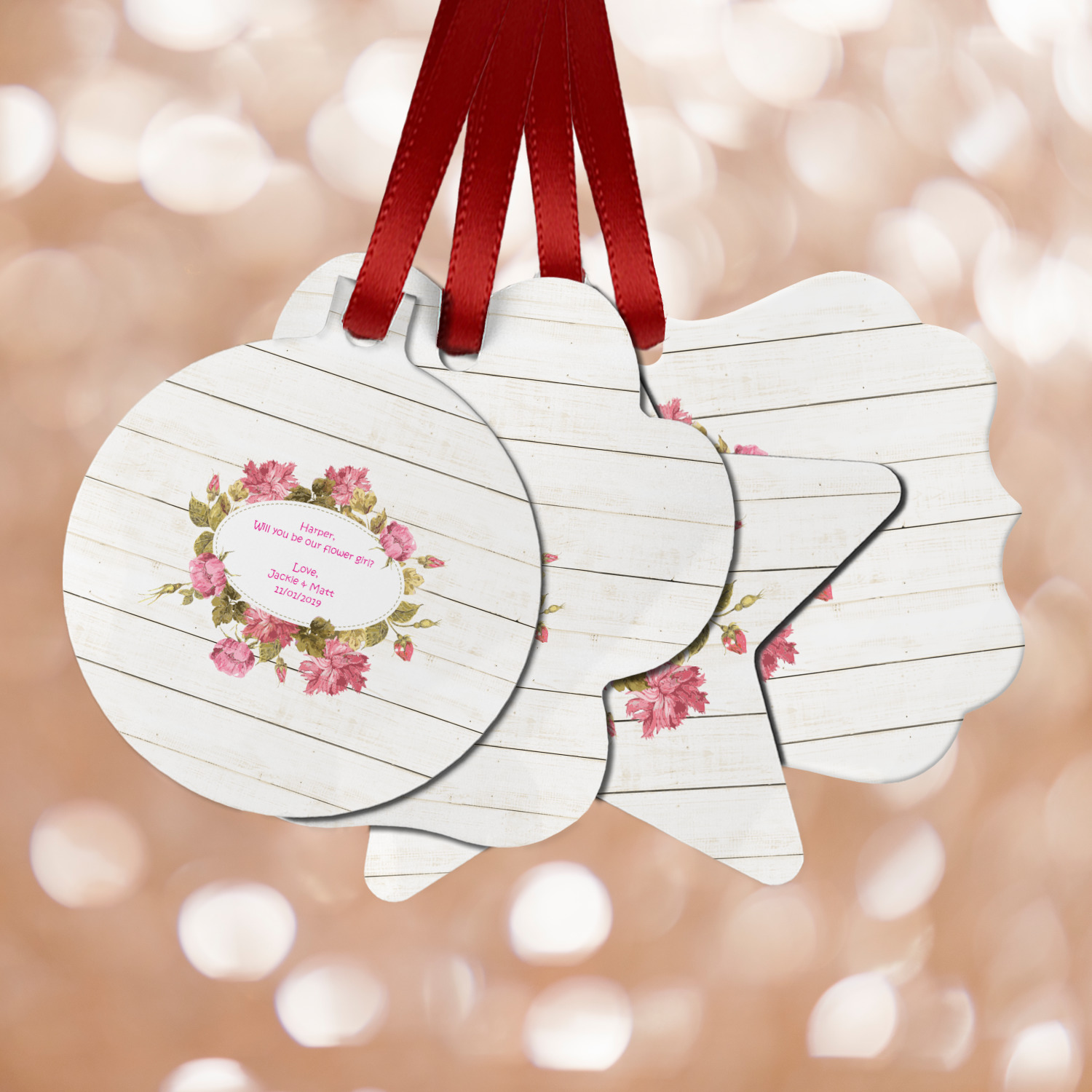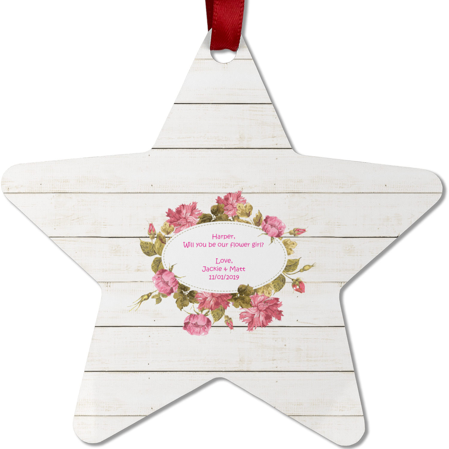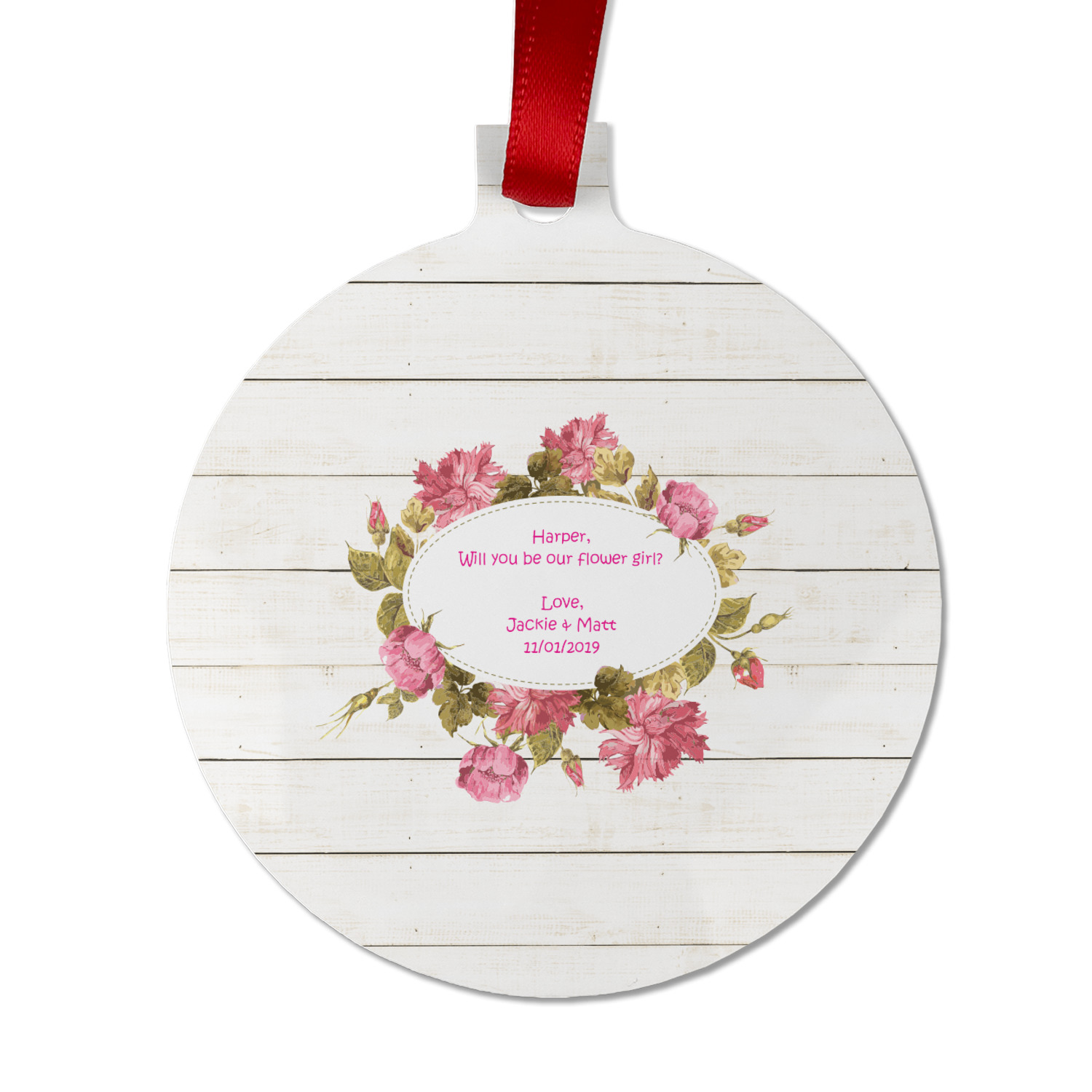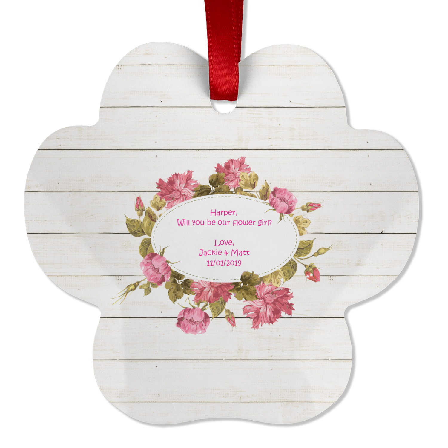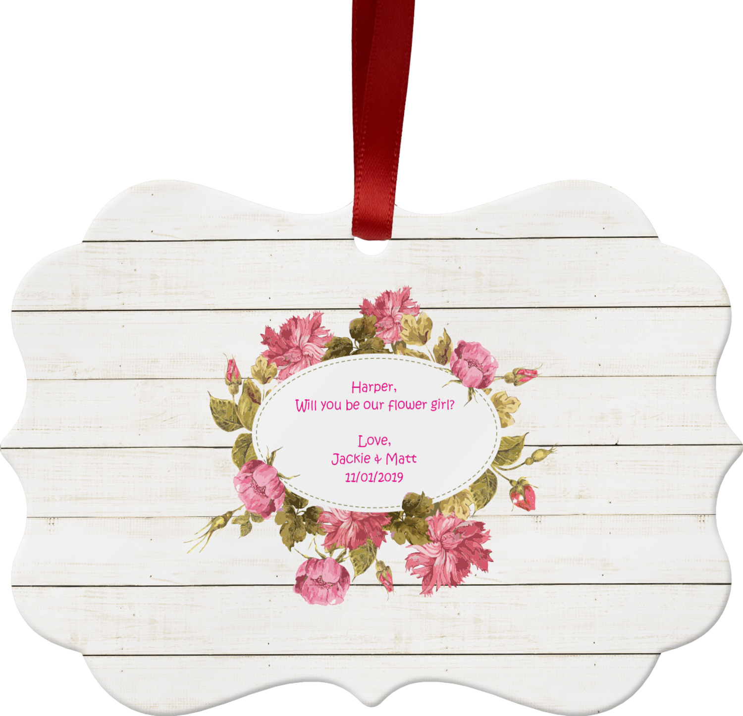 The main design has a background of weathered wooden planks. A beautiful light pink flower frame is used as the focal point of this design. The pink color of the frame and the personalization inside is the perfect contrast to the light colored wood.
