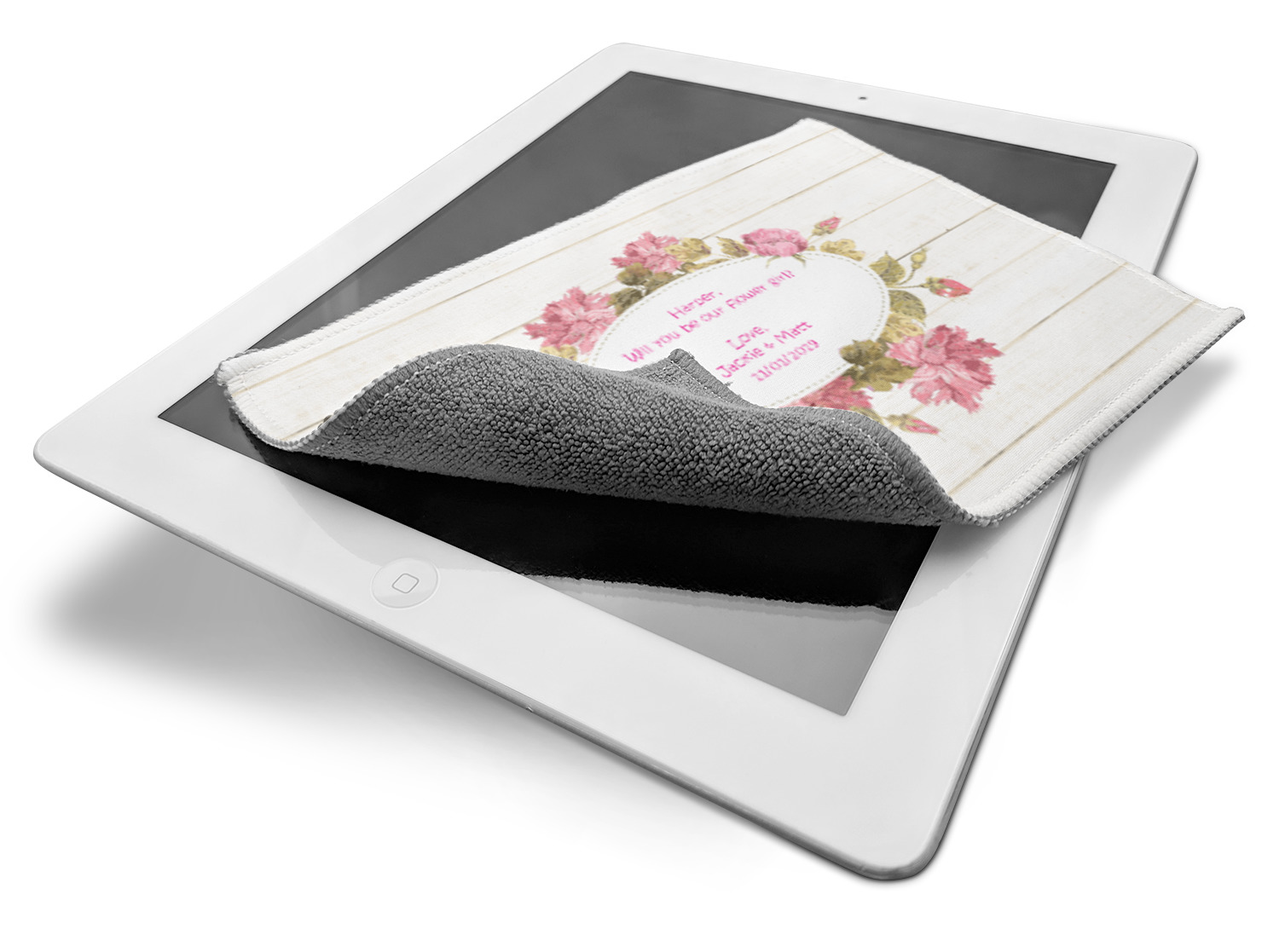 The back of this cleaning cloth is made from a gentle, grey microfiber material, that is masterful at removing smudges, grease, and fingerprints from lenses or electronic screens. The front side of the screen cleaner displays your personalized design in vibrant color. A beautiful stitch lines the edges and secures the microfiber to the polyester top. We provide you with the option of customizing this screen horizontally or vertically, depending on your preferences.
