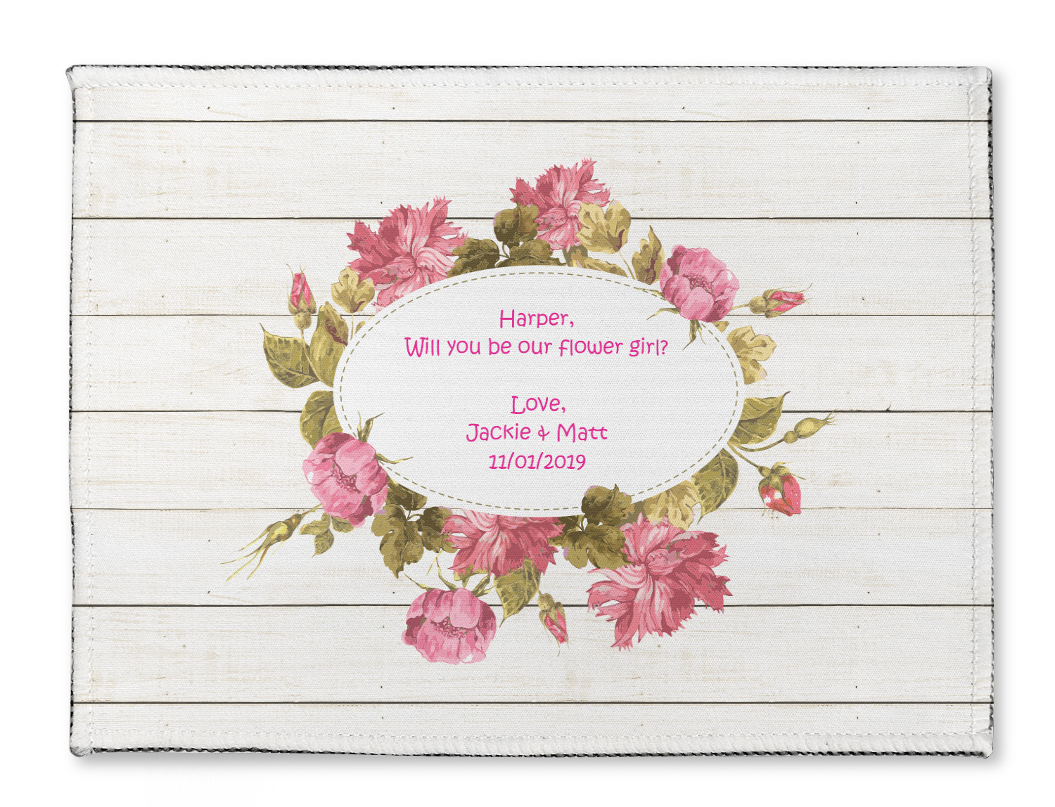 The main design has a background of weathered wooden planks. A beautiful light pink flower frame is used as the focal point of this design. The pink color of the frame and the personalization inside is the perfect contrast to the light colored wood.