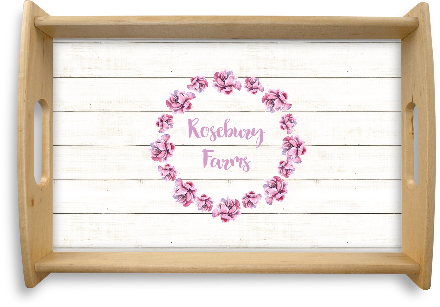 This serving tray with handles features square edges and two rounded sides, creating a very modern look. Each side is fabricated from a beautifully cut, natural wood. The bottom of the interior of the tray displays your customized design in bright, vibrant color. The tray is sold in both a black color and a natural wood look. Each variation of the wood serving tray has two sizes: Small, which is 14" x 10" x 2.25", and Large, which is 19.5" x 13.5" x 2.75".
