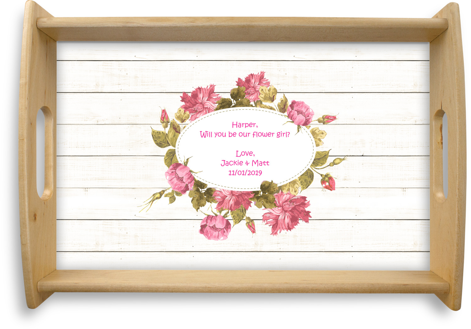 The main design has a background of weathered wooden planks. A beautiful light pink flower frame is used as the focal point of this design. The pink color of the frame and the personalization inside is the perfect contrast to the light colored wood.