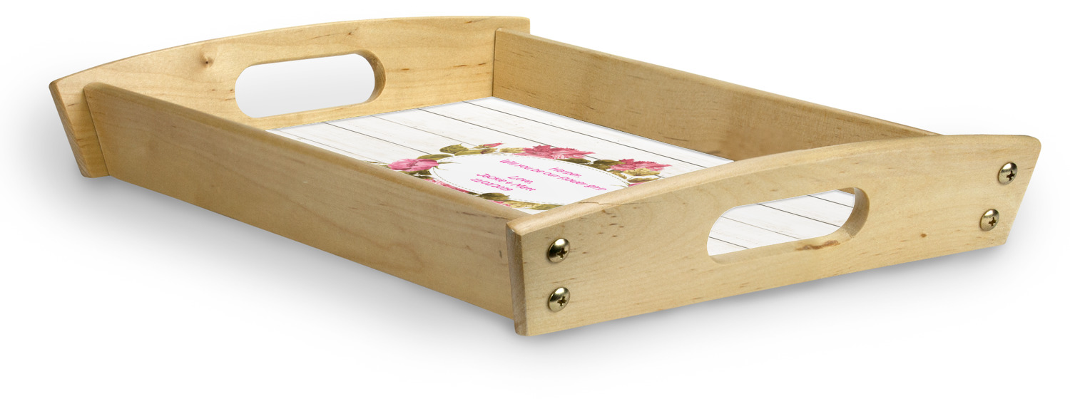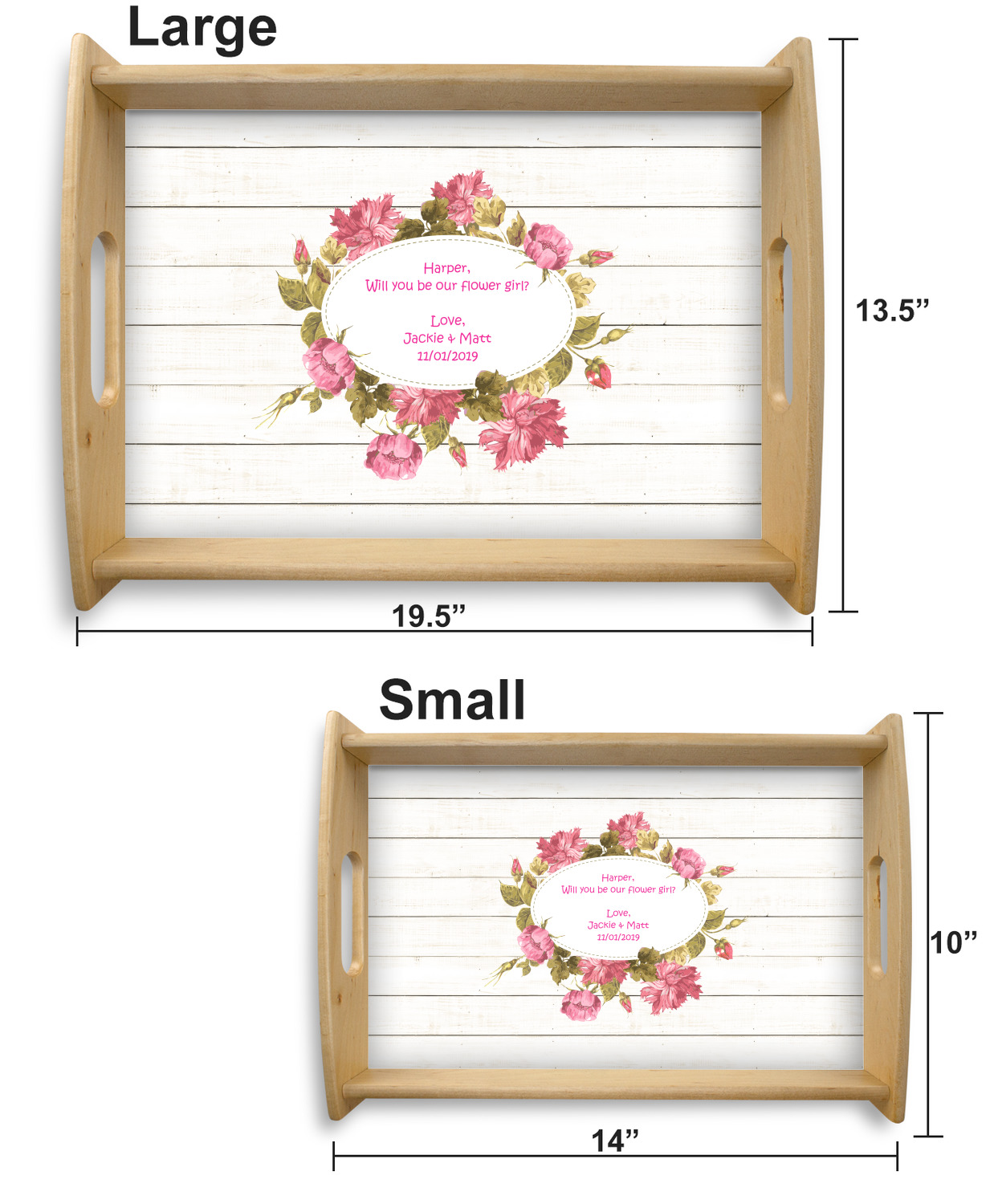 This serving tray with handles features square edges and two rounded sides, creating a very modern look. Each side is fabricated from a beautifully cut, natural wood. The bottom of the interior of the tray displays your customized design in bright, vibrant color. The tray is sold in both a black color and a natural wood look. Each variation of the wood serving tray has two sizes: Small, which is 14" x 10" x 2.25", and Large, which is 19.5" x 13.5" x 2.75".