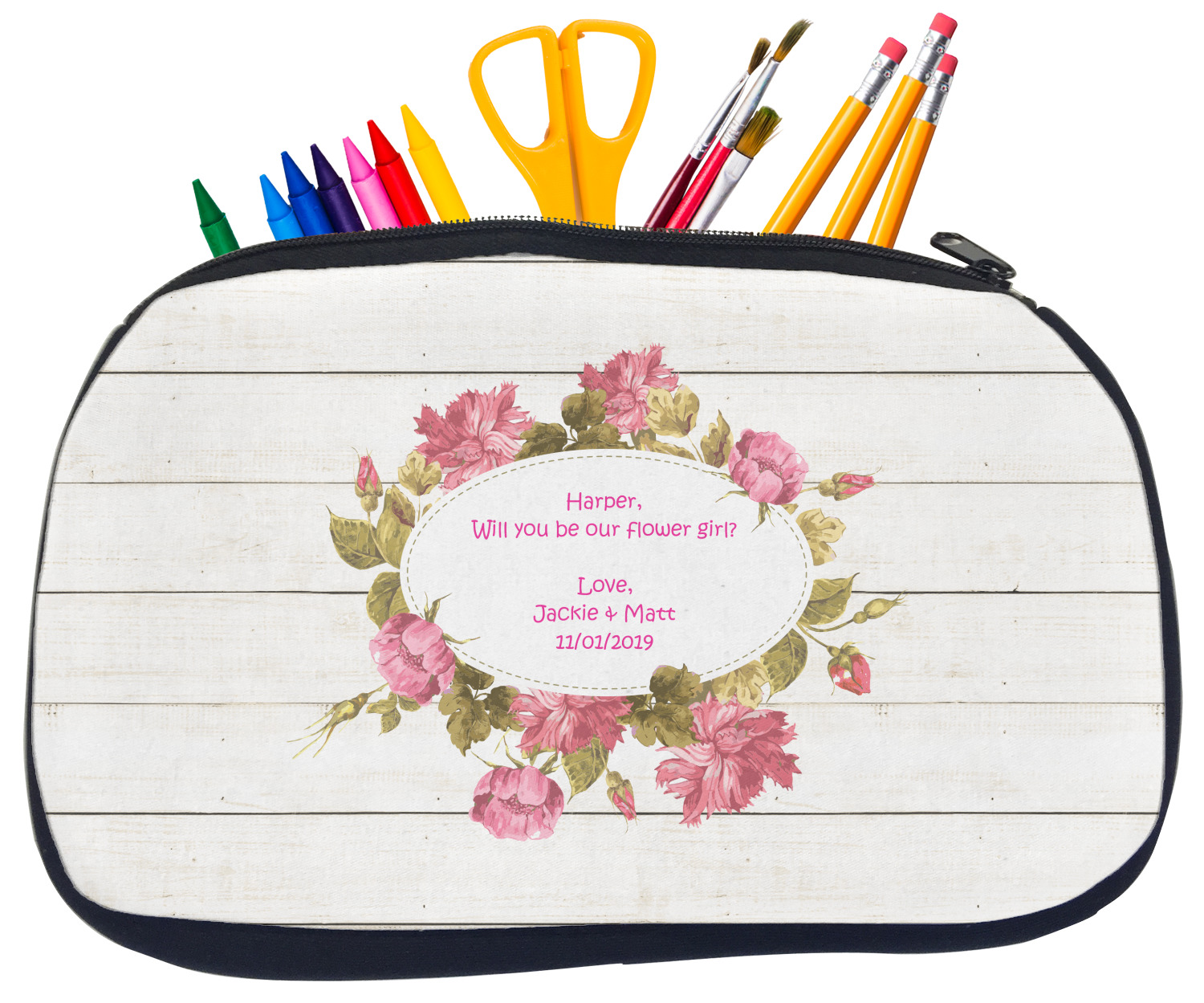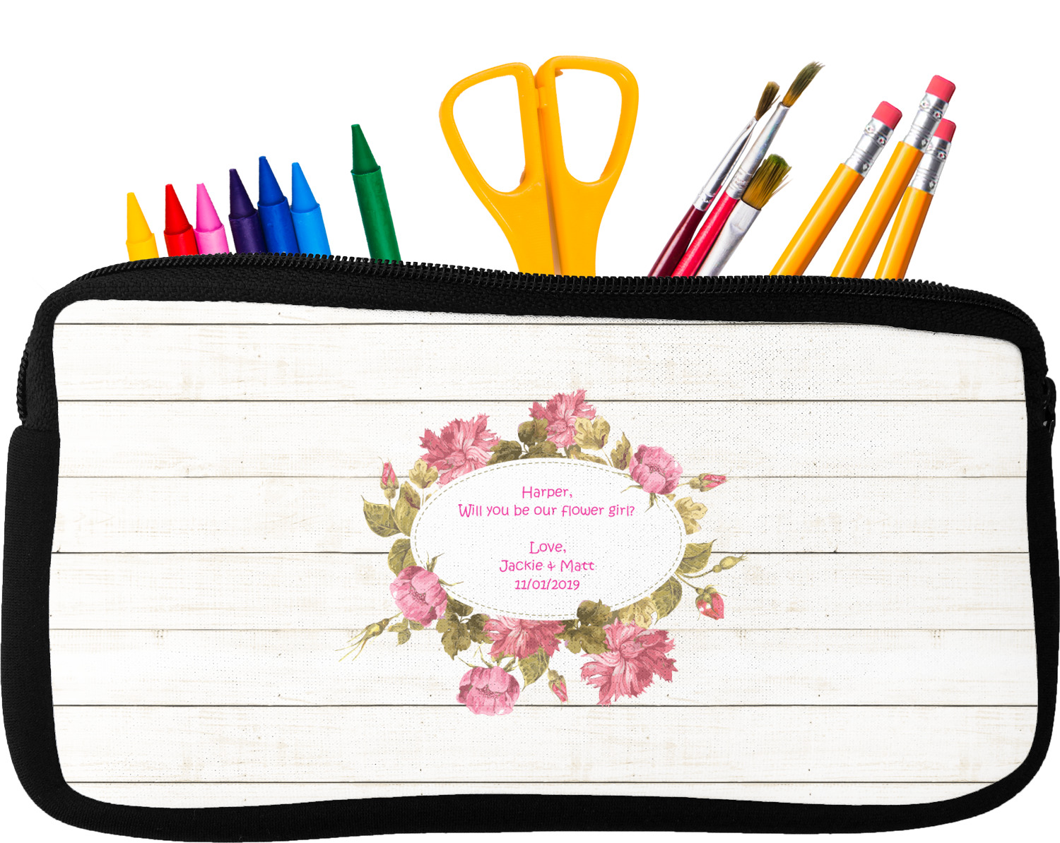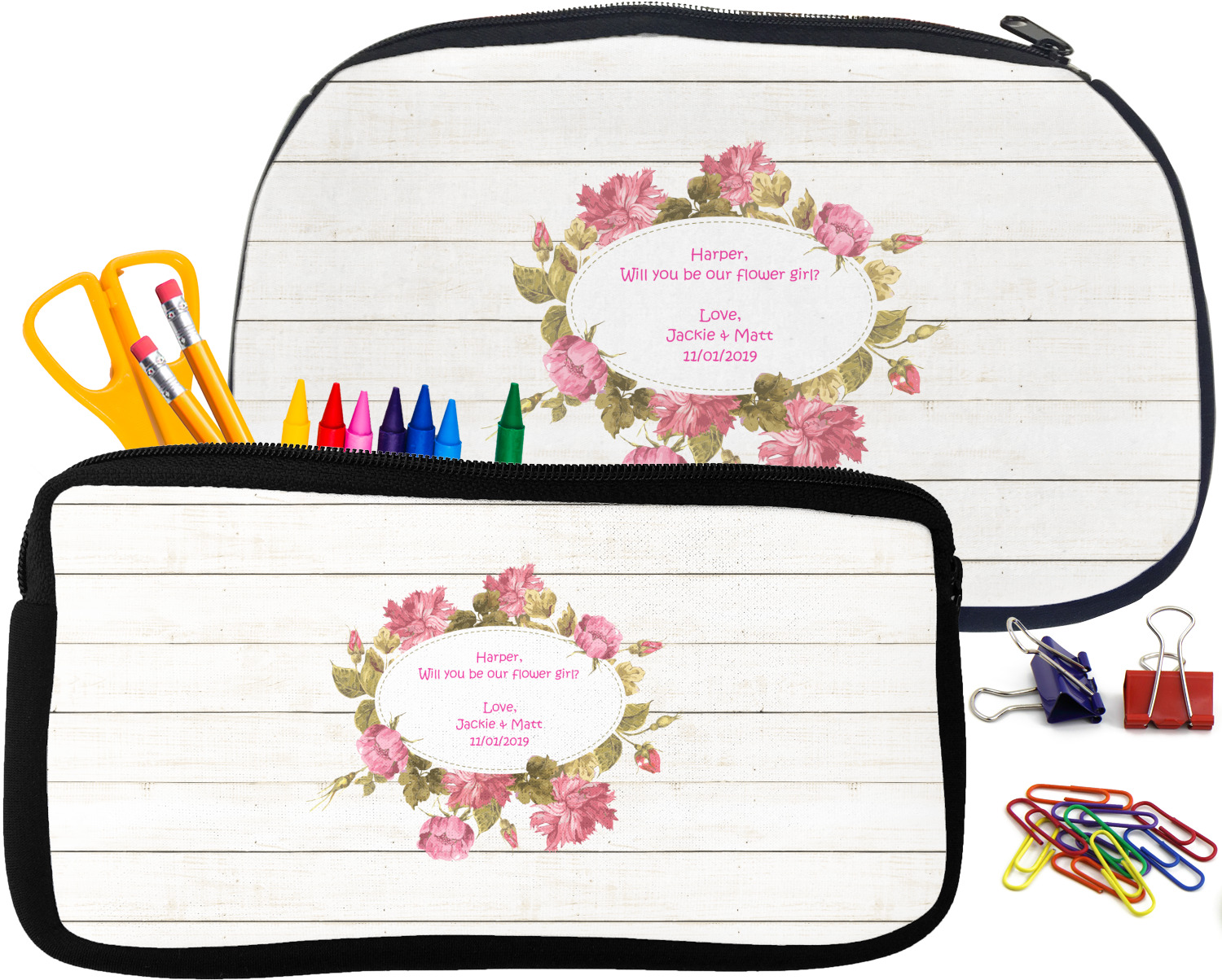 Built from durable neoprene, these pencil pouches, are water resistant, and prevent leaking ink from spilling into your backpack or purse. These custom pencil cases secure with a robust, black zipper. We print your personalized design on the front of this pouch, while the remaining sides a simple black color. These colored pencil cases [880] are sold in two sizes; our smaller version measures at 8.5 by 4.5 inches, while the medium measures at 10.5 by 6.5 inches. The smaller size is more suitable for holding pencils and pens, while our medium size can accommodate pencil sharpeners, scissors, and erasers.
