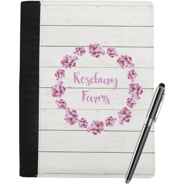 These personalized padfolios are made from a black, polyester microfiber and features a standard, 50-page notepad. However, these black padfolios can accommodate a pad with up to 100 pages. This model also features a slot pocket for any loose sheets of paper, small pockets for business cards, and an elastic band to secure a pen. We print your personalization across the front of this notepad portfolio in bright, vibrant color. These padfolios come in 2 sizes, Medium - approximately 10.25" x 8" for 5" x 8" paper and Large - approximately 12.5" x 8.5" for 8.5" x 11" paper.
