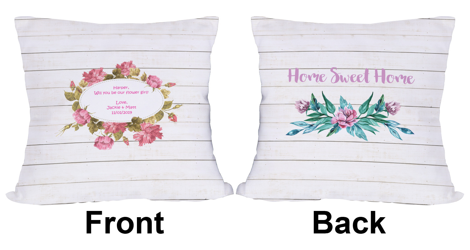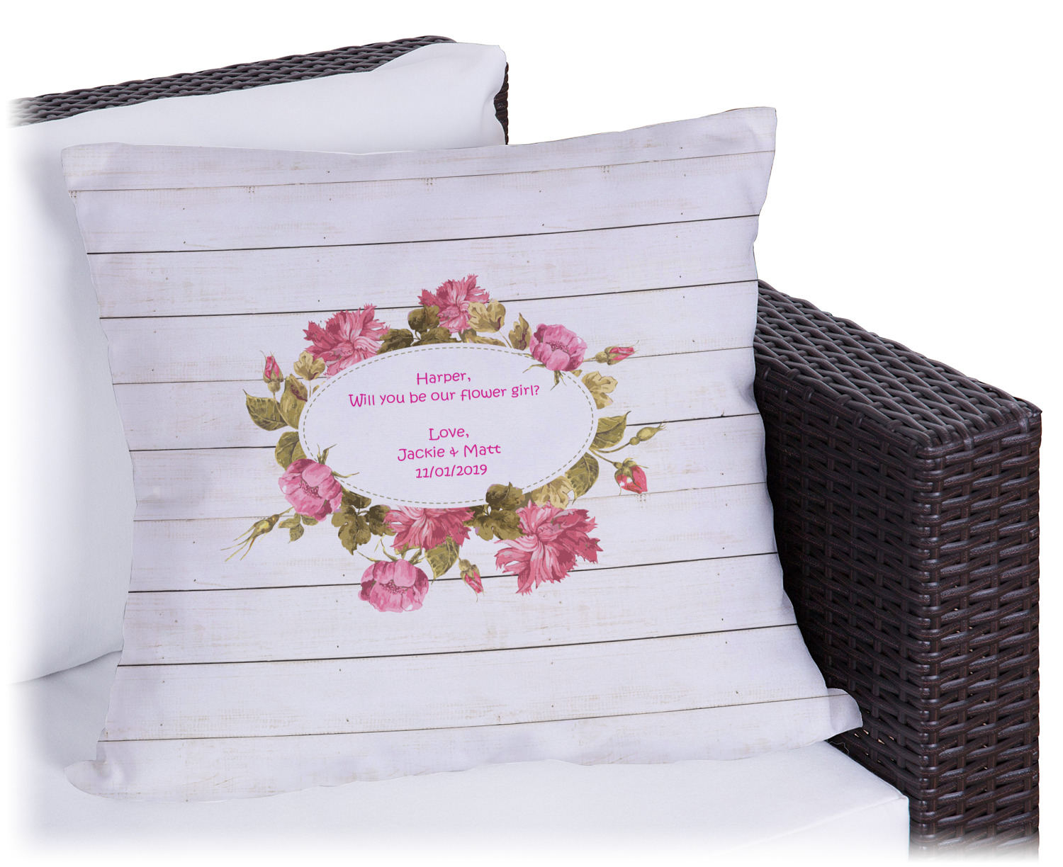 The main design has a background of weathered wooden planks. A beautiful light pink flower frame is used as the focal point of this design. The pink color of the frame and the personalization inside is the perfect contrast to the light colored wood.