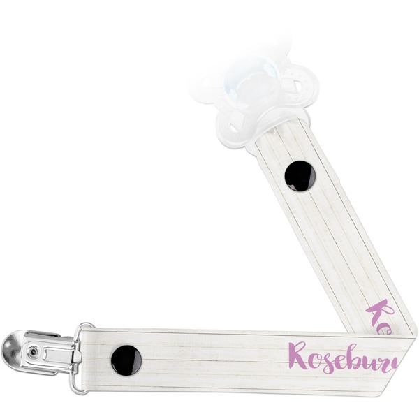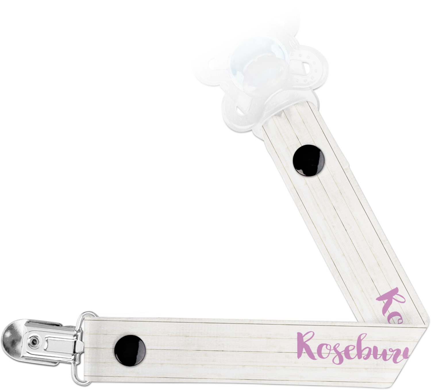 This personalized pacifier clip is the ideal size and measures at approximately 7.5 inches in length, when either end is snapped closed. On one end, you'll find a snap button. This button of your baby's pacifier holder is what can be attached to their pacifier to hold is securely in place. Simply open the snap, slip it through the pacifier opening, and snap it back into place. On the opposite end of this baby pacifier holder, you'll find a metal clip that can secure to a baby's collar or sleeve. This clip ensures that the strap stays in place, and that your baby's pacifier is always on hand.