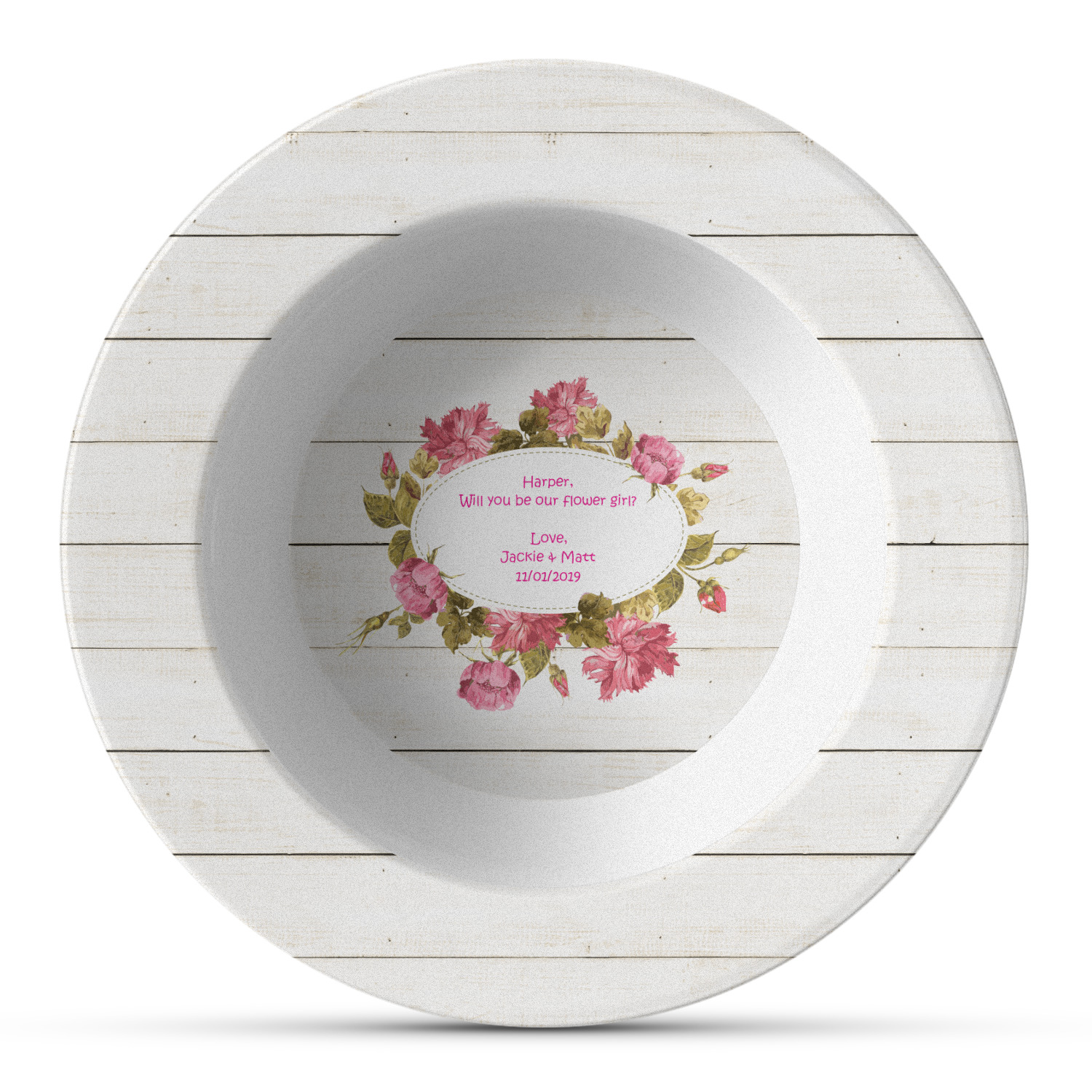 Made from a composite, thermo-set, polymer plastic, these dinner bowls have the versatility, durability, and weight of a melamine bowl without any of the downsides of melamine. Unlike melamine dinnerware, these bowls can withstand high heat. These custom plastic bowls can even handle temperatures of up to 250 degrees Fahrenheit, for up to 60 minutes. The pieces of our plastic dinner set are never made with harmful chemicals, such as BPAs, formaldehyde, DEHPs. We display your personalization on the base of this bowl's interior, while the bowl itself has an 8.75" diameter and is 1.75" tall.