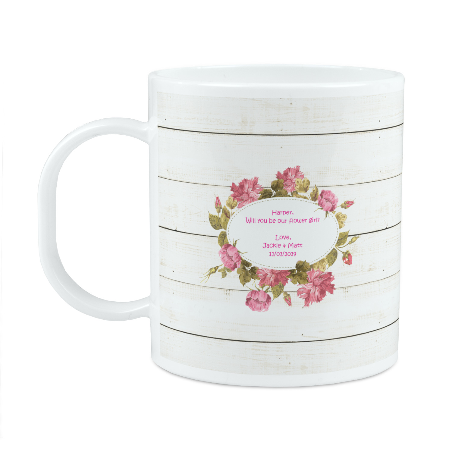 The main design has a background of weathered wooden planks. A beautiful light pink flower frame is used as the focal point of this design. The pink color of the frame and the personalization inside is the perfect contrast to the light colored wood.
