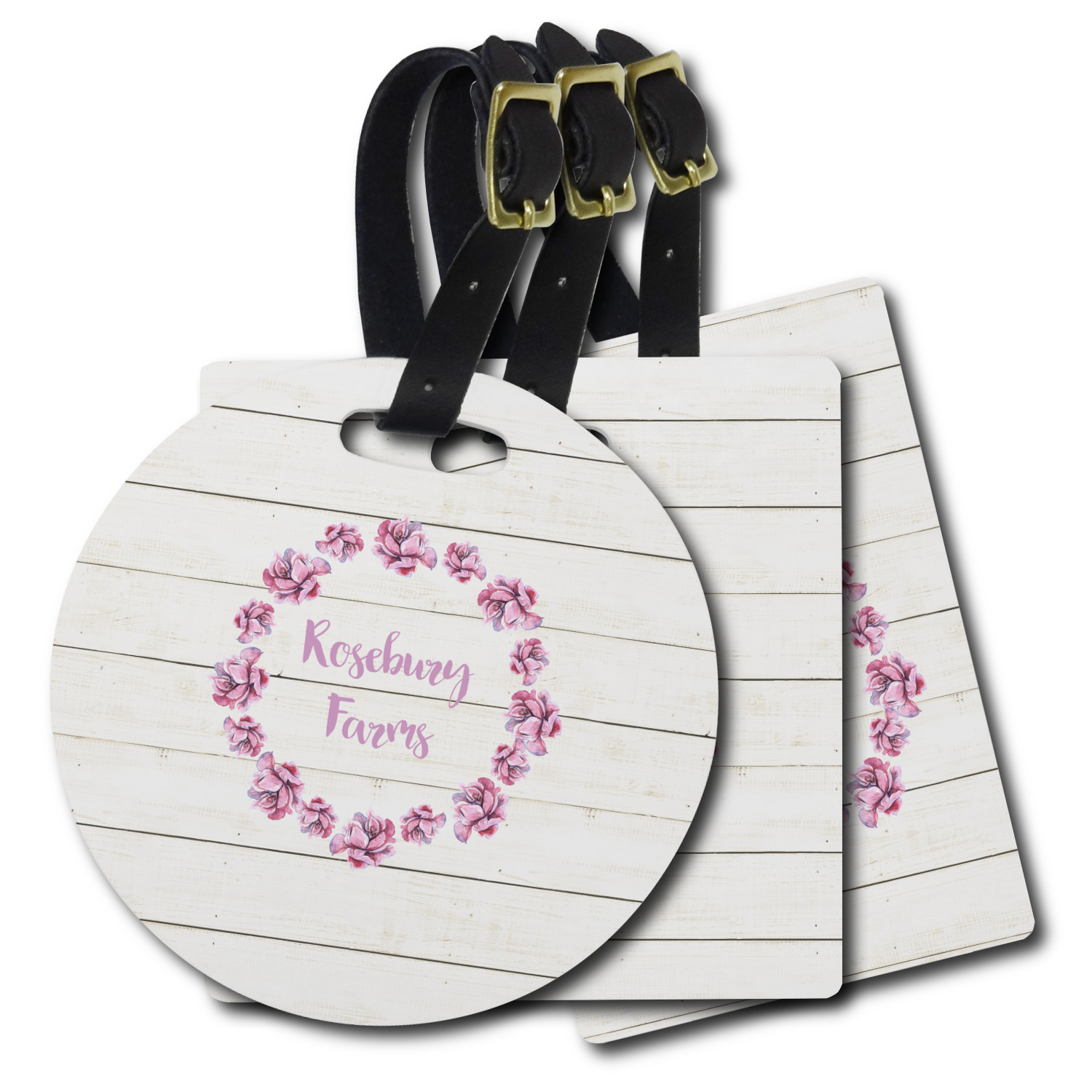 These personalized bag tags are sold in a variety of shapes, so that you may find the product that meets your vision exactly. We sell a round luggage tag, which measures at approximately 4" x 4". Our square luggage tag is about 3.5" x 3.5", while our rectangular version is 2.75" x 4 ".