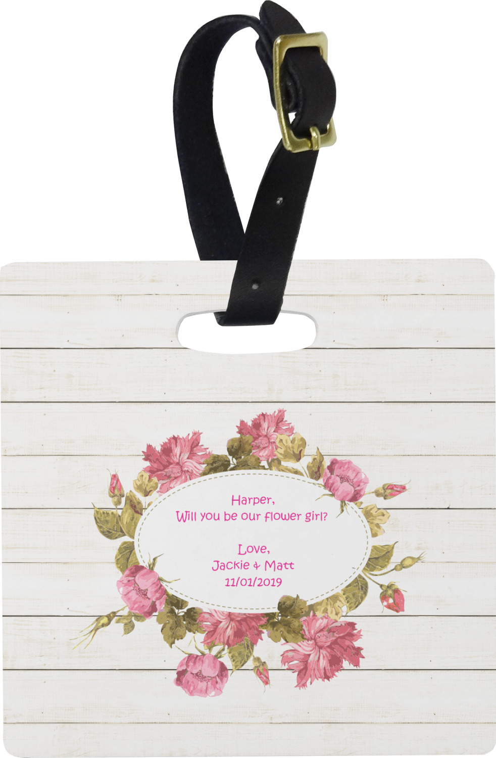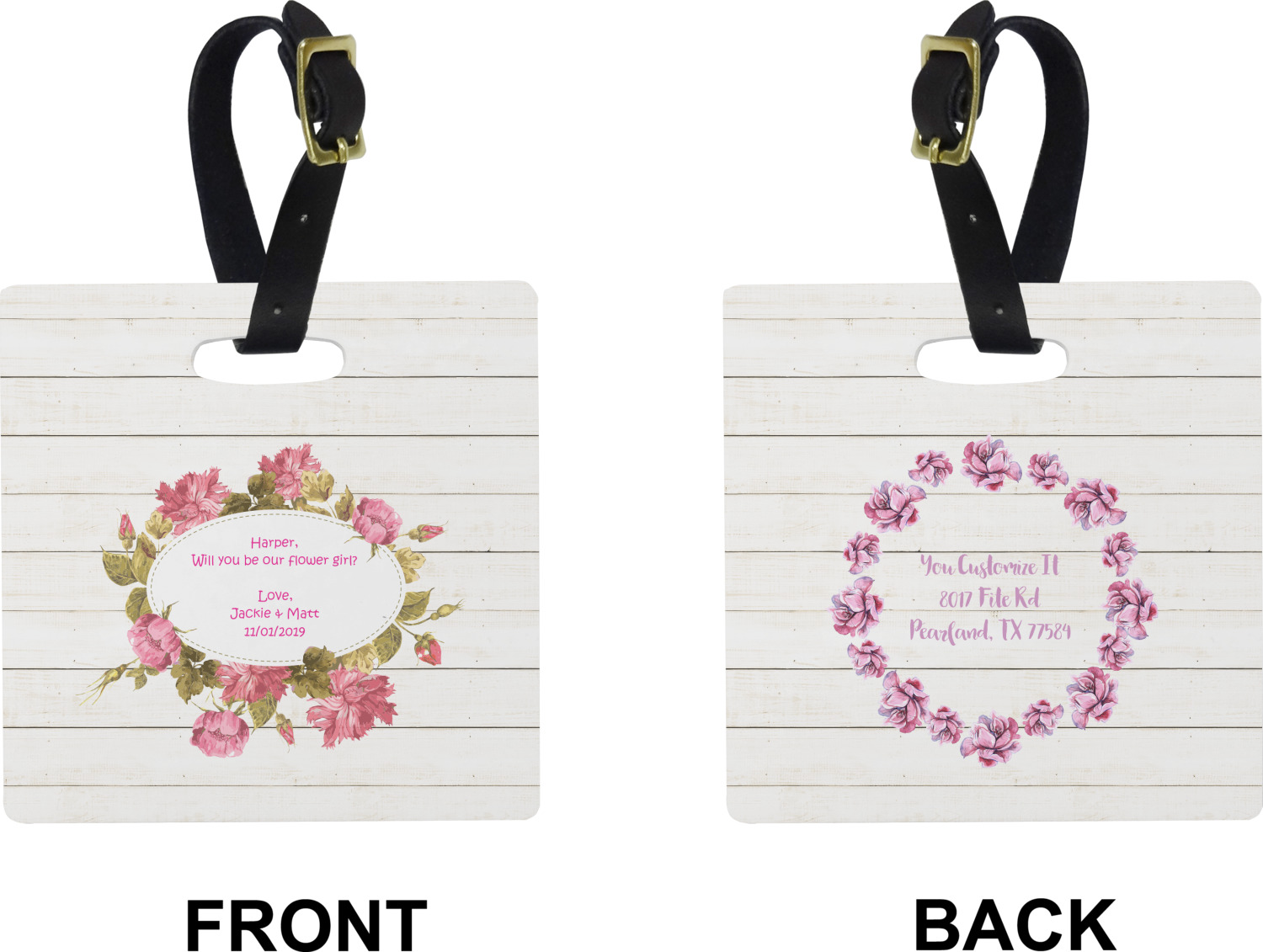 These personalized bag tags are sold in a variety of shapes, so that you may find the product that meets your vision exactly. We sell a round luggage tag, which measures at approximately 4" x 4". Our square luggage tag is about 3.5" x 3.5", while our rectangular version is 2.75" x 4 ".
