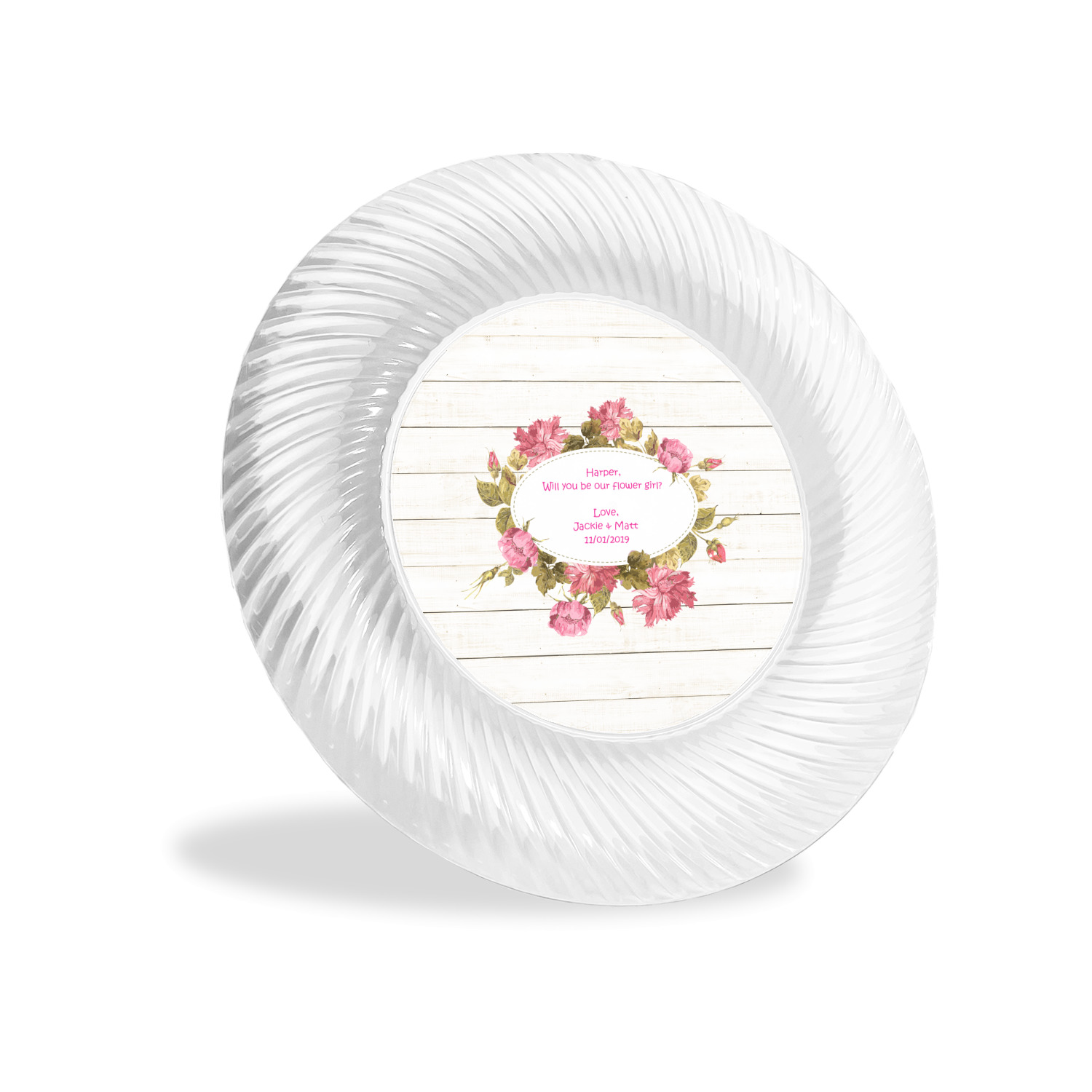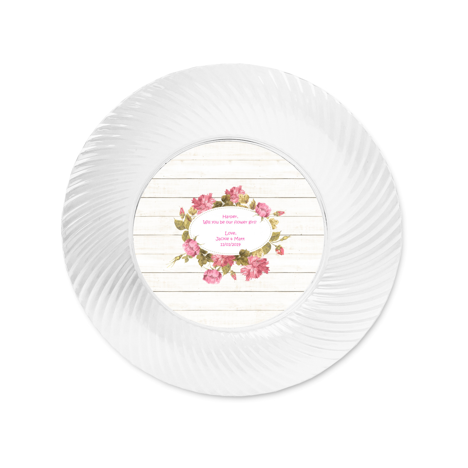 Made from a beautiful clear plastic plate as a base, your design is printed to the underside of the plate. The outside of the plate has a classic swirl texture to it for a high quality look and feel.