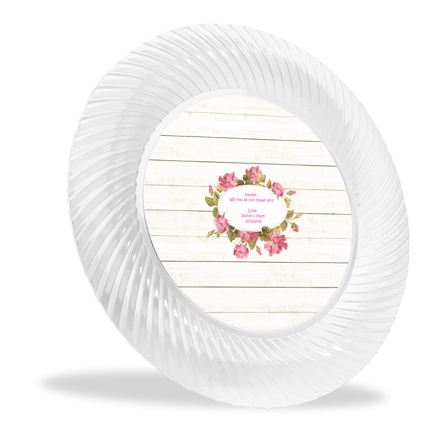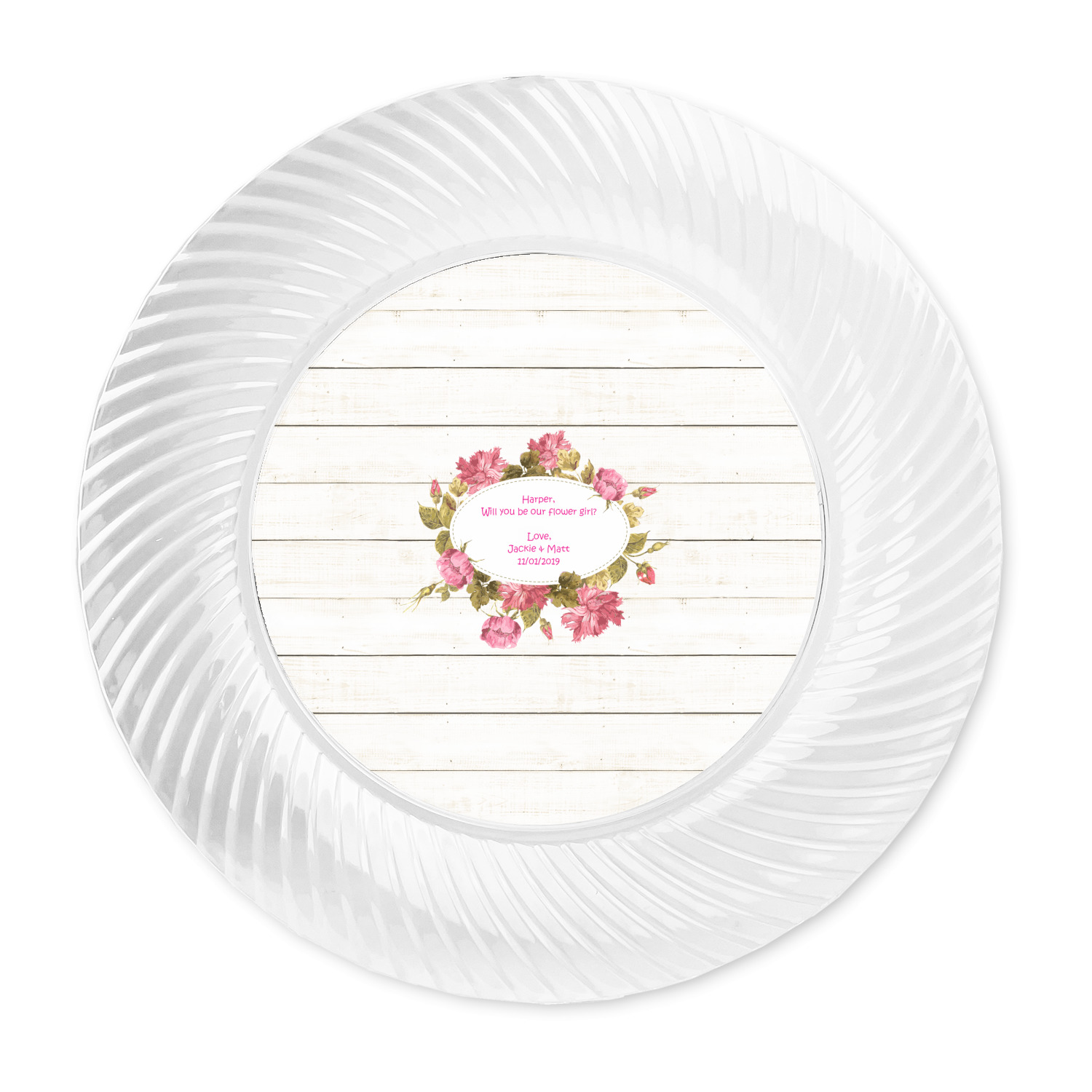 Made from a beautiful clear plastic plate as a base, your design is printed to the underside of the plate. The outside of these disposable plates has a classic swirl texture to it for a high quality look and feel.