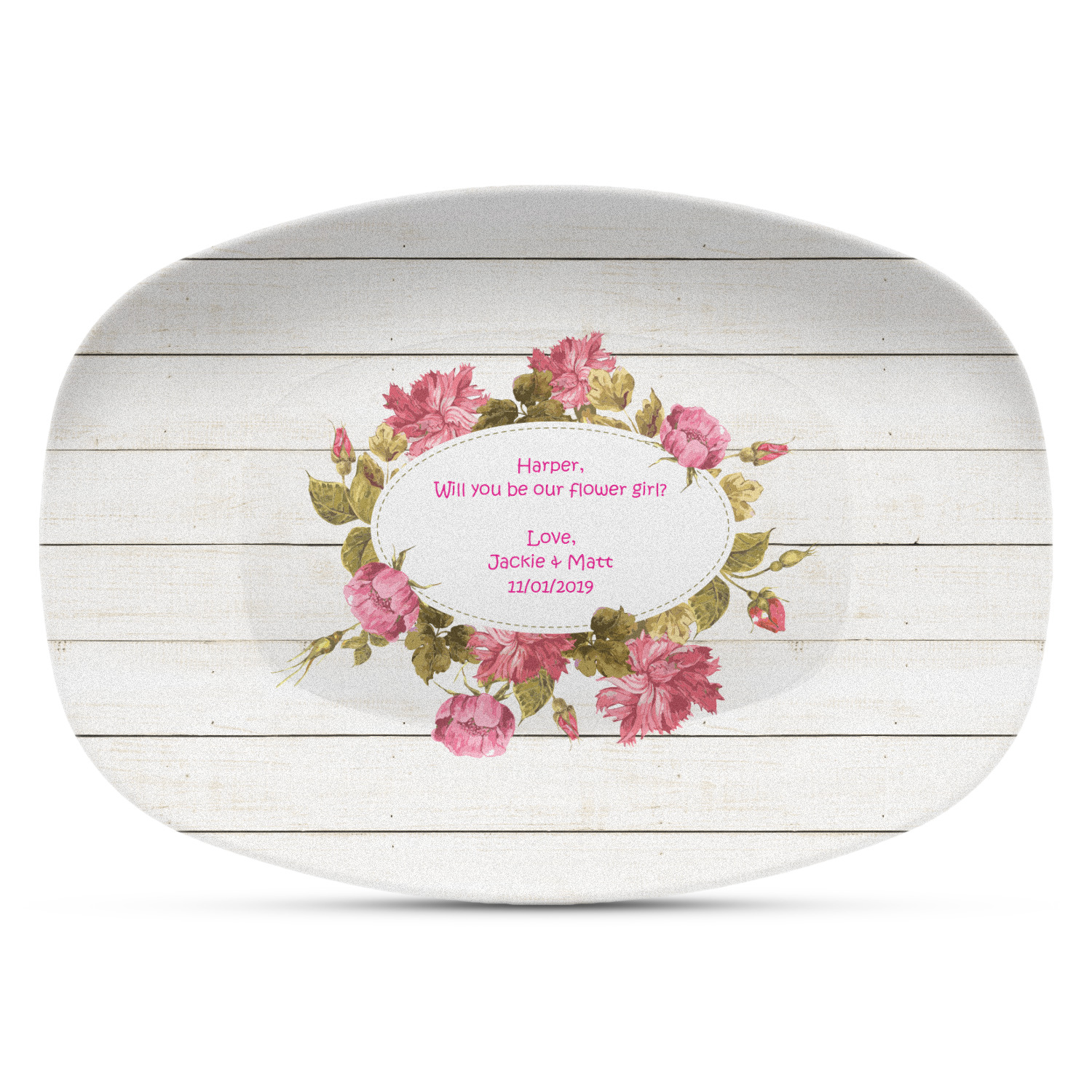 The main design has a background of weathered wooden planks. A beautiful light pink flower frame is used as the focal point of this design. The pink color of the frame and the personalization inside is the perfect contrast to the light colored wood.