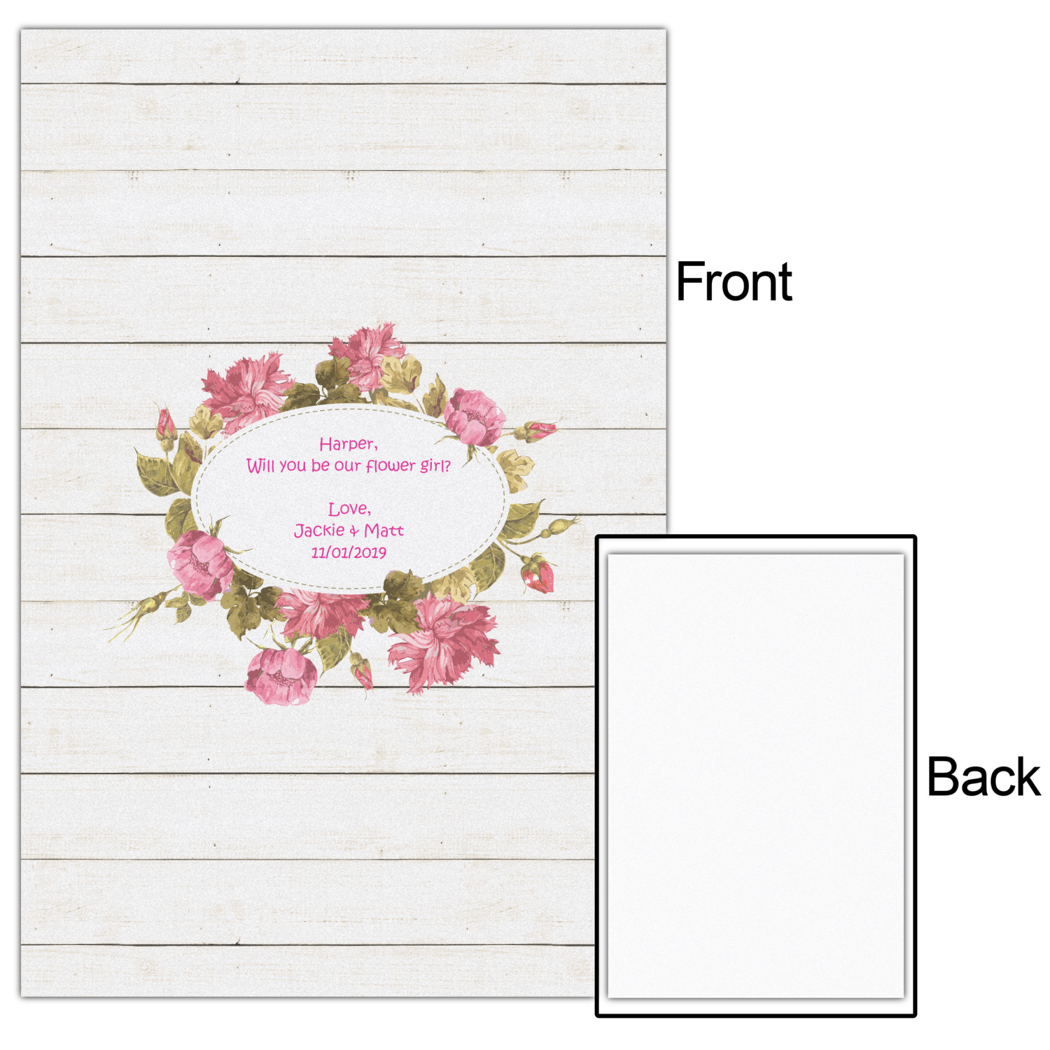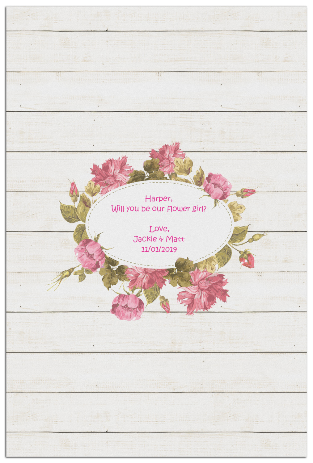 The main design has a background of weathered wooden planks. A beautiful light pink flower frame is used as the focal point of this design. The pink color of the frame and the personalization inside is the perfect contrast to the light colored wood.