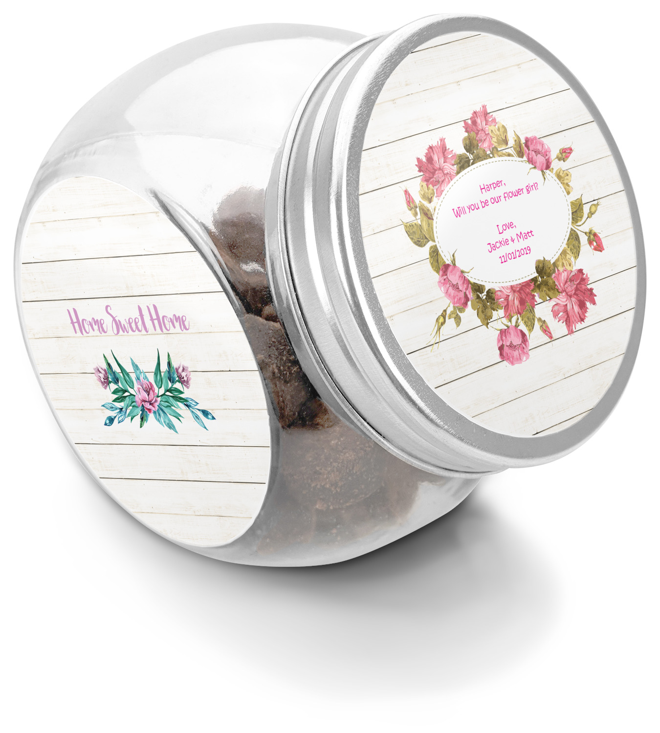 This treat jar is an excellent way to store treats for your favorite canine or feline. Moreover, their delicate, classy appearance makes them a tasteful addition to your countertop's décor. Crafted from clear glass, its unique construction and silver metal, screw-on lid allows for quick and easy access. Three, permanent, vinyl stickers are applied to both sides of the jar and lid, presenting your personalized design. The base of this glass, dog treat jar is 3.4" x 4.75", and the jar stands at 5" tall. Though on the smaller side, this jar is best suited for smaller treats or training treats.