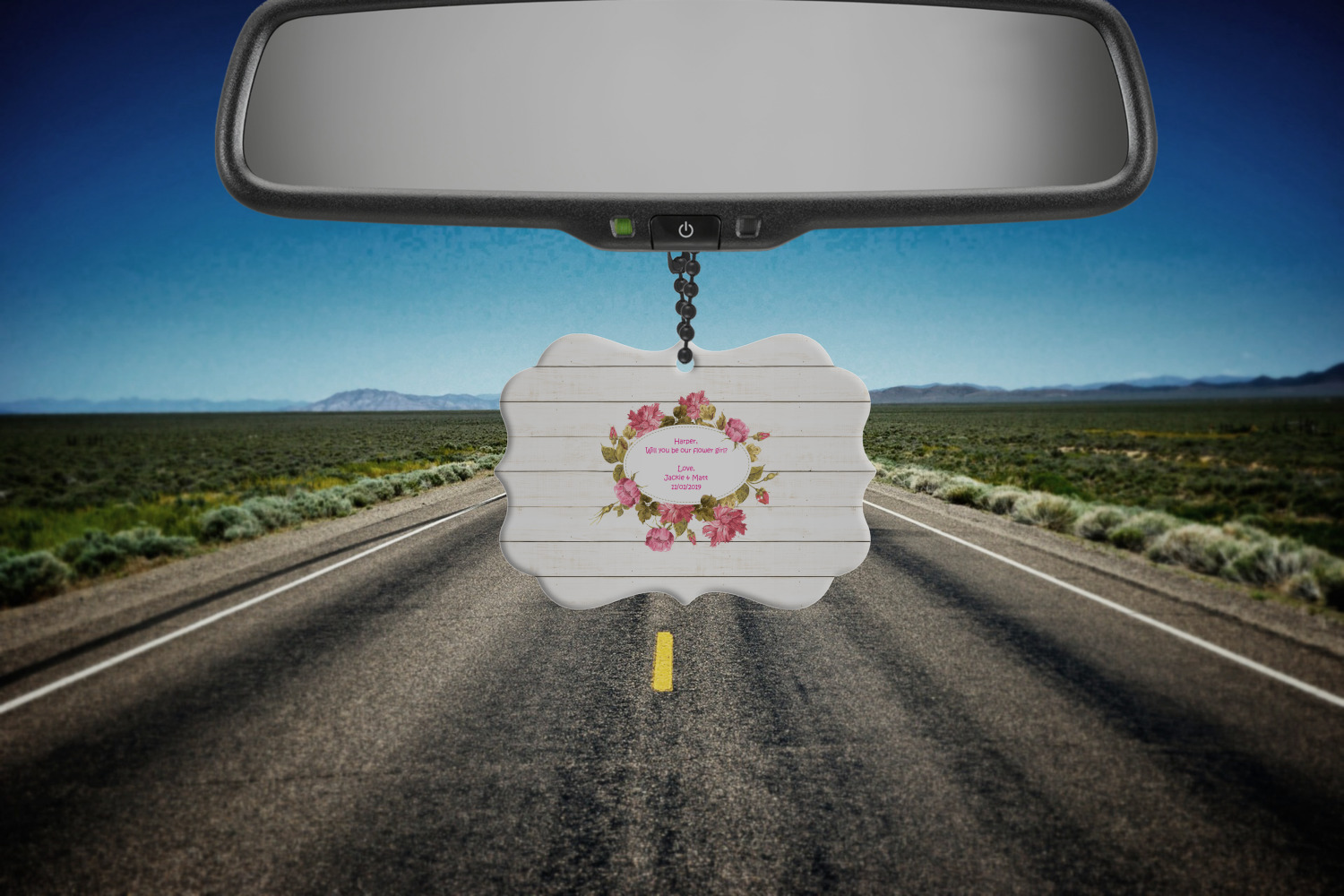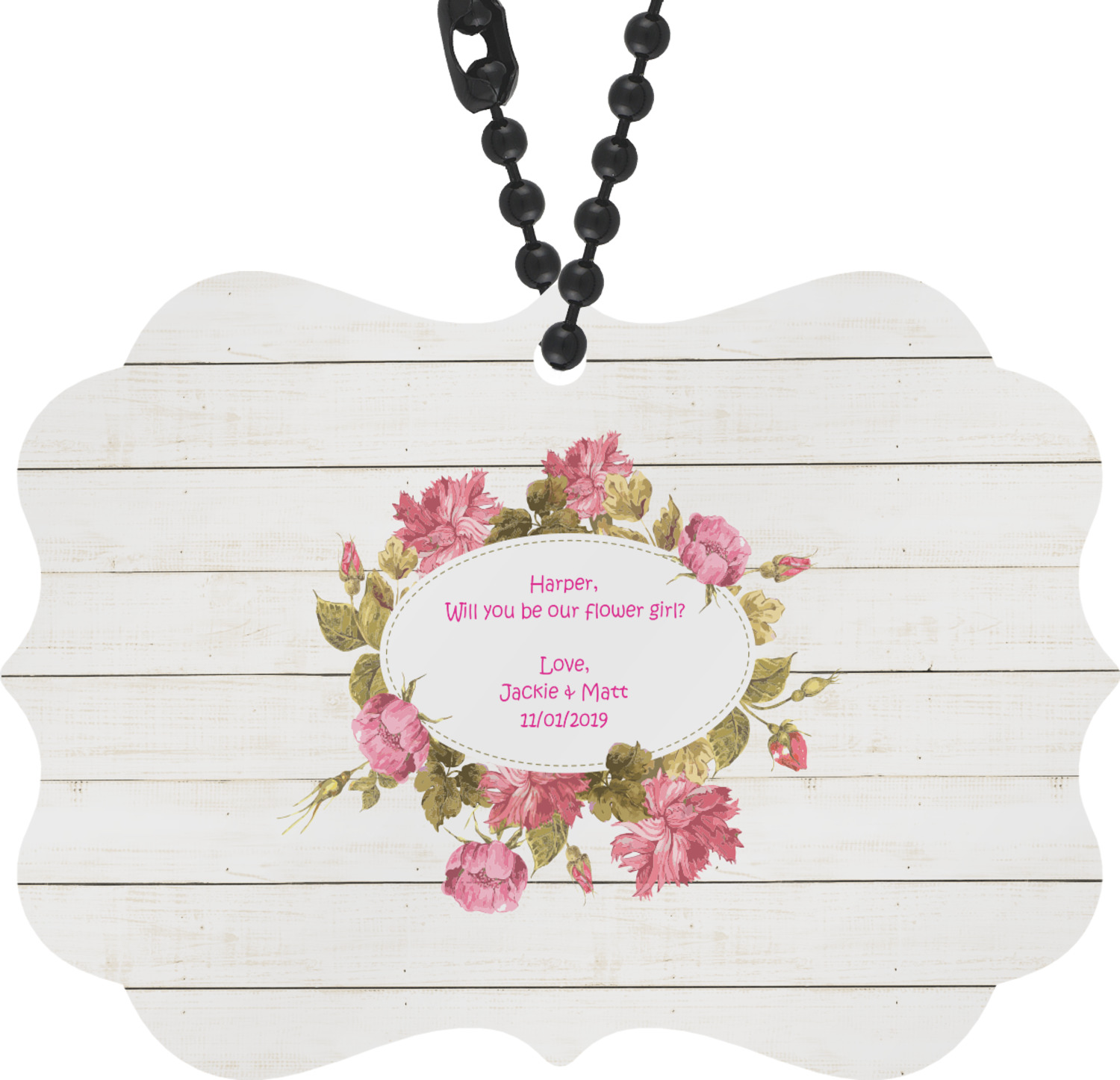 The main design has a background of weathered wooden planks. A beautiful light pink flower frame is used as the focal point of this design. The pink color of the frame and the personalization inside is the perfect contrast to the light colored wood.