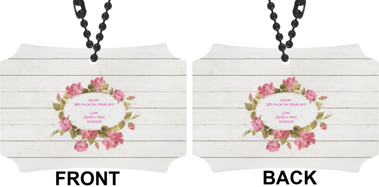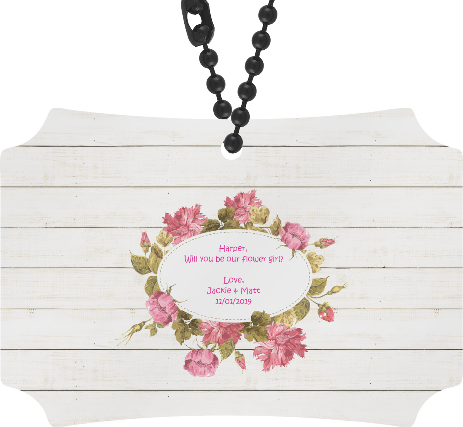 The main design has a background of weathered wooden planks. A beautiful light pink flower frame is used as the focal point of this design. The pink color of the frame and the personalization inside is the perfect contrast to the light colored wood.