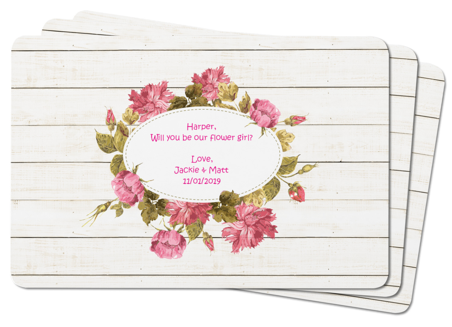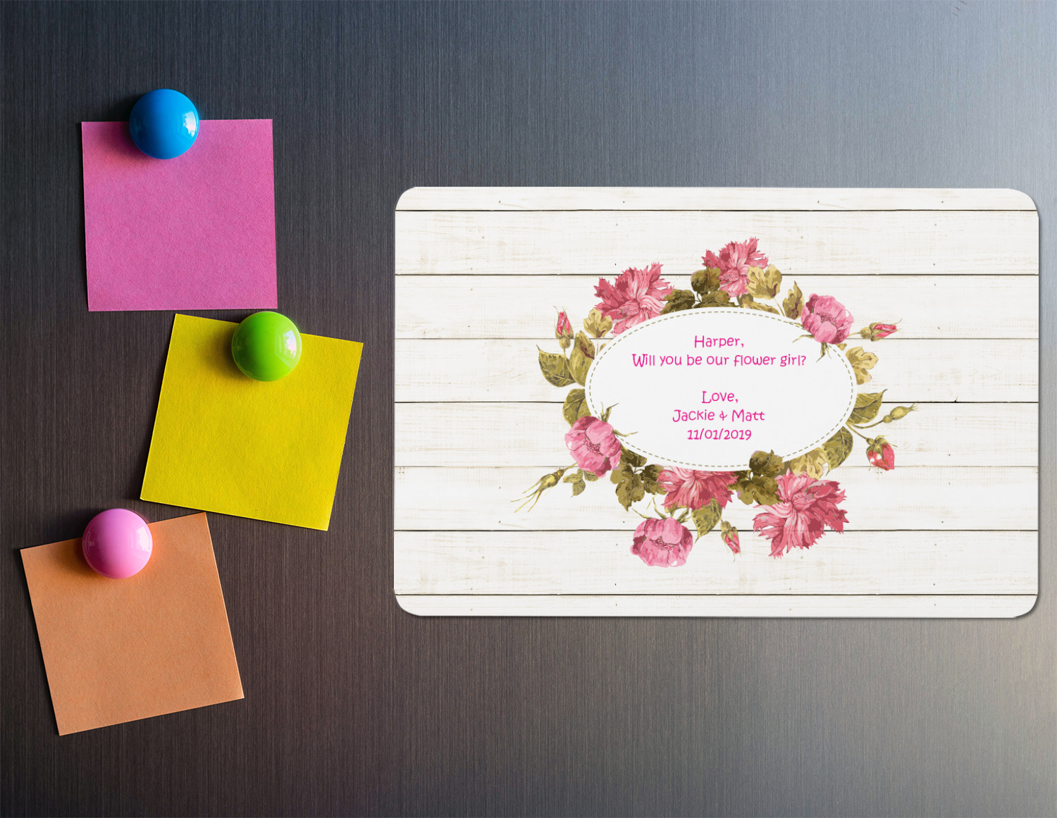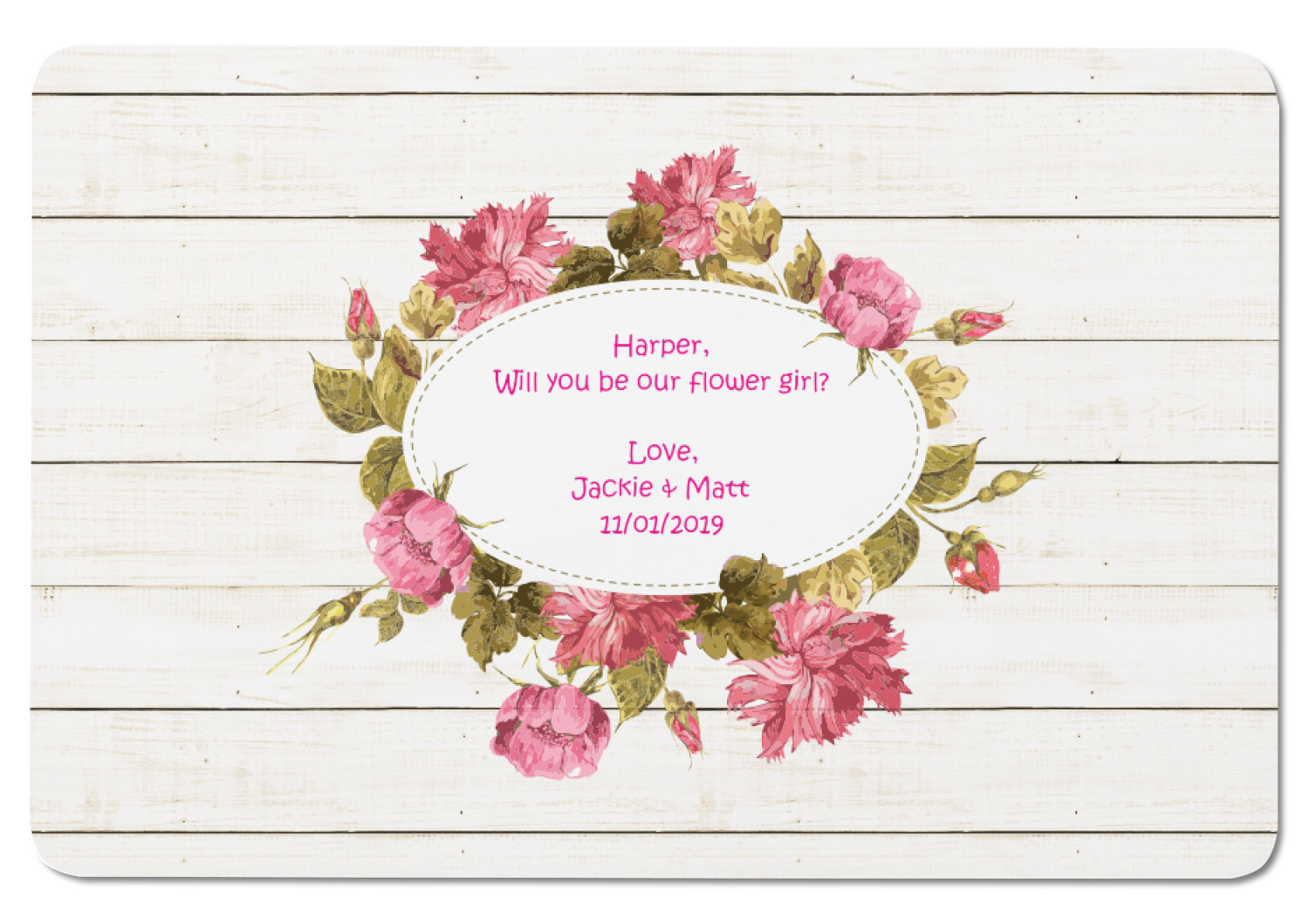 The main design has a background of weathered wooden planks. A beautiful light pink flower frame is used as the focal point of this design. The pink color of the frame and the personalization inside is the perfect contrast to the light colored wood.