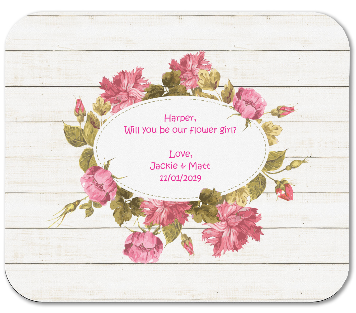 The main design has a background of weathered wooden planks. A beautiful light pink flower frame is used as the focal point of this design. The pink color of the frame and the personalization inside is the perfect contrast to the light colored wood.