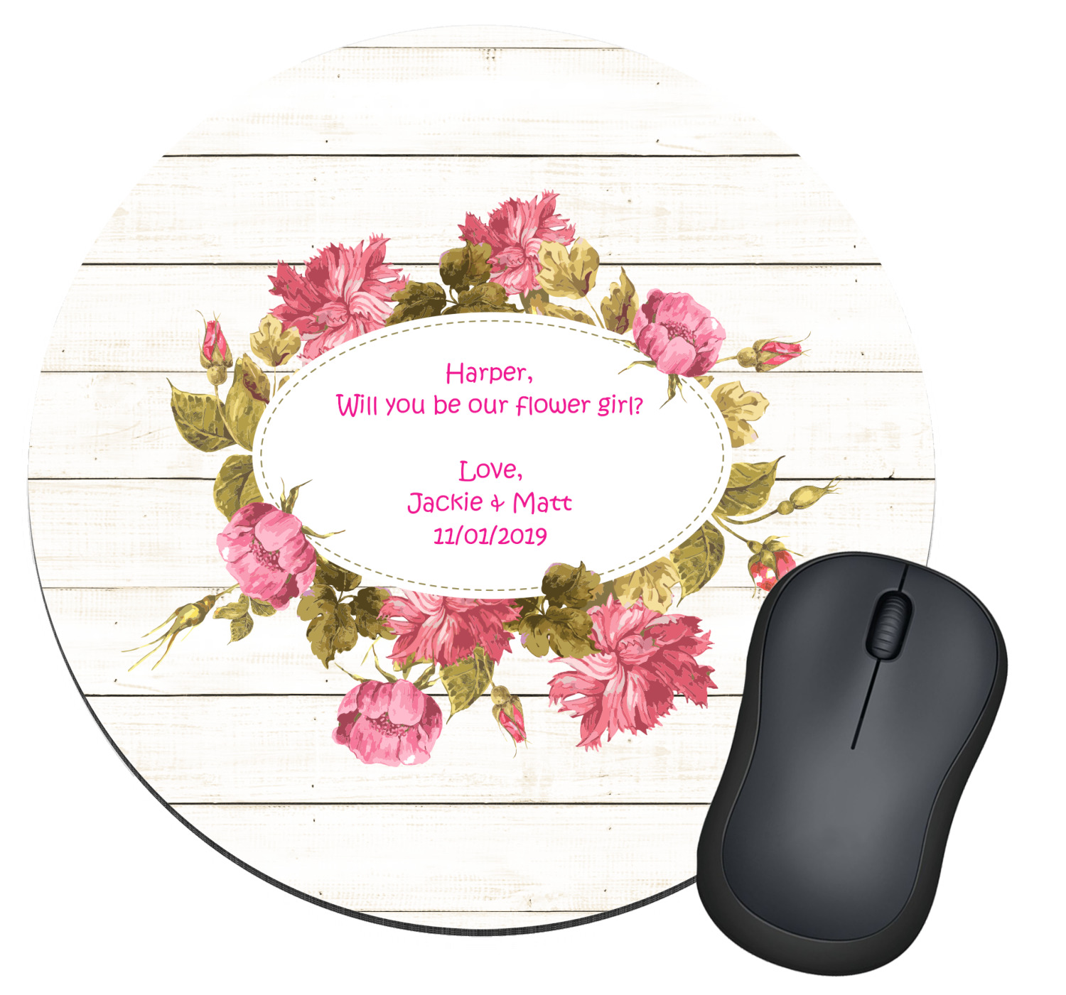The main design has a background of weathered wooden planks. A beautiful light pink flower frame is used as the focal point of this design. The pink color of the frame and the personalization inside is the perfect contrast to the light colored wood.