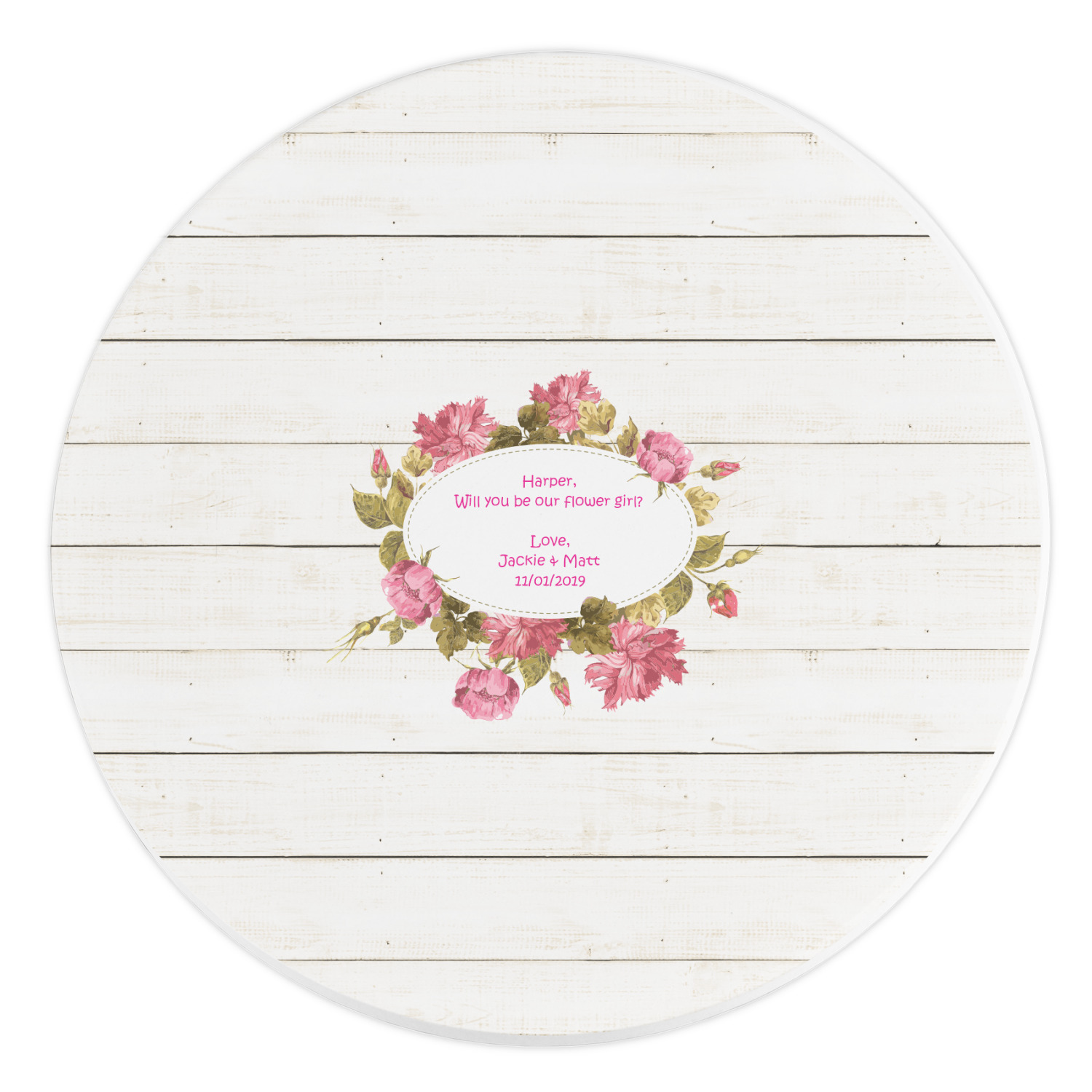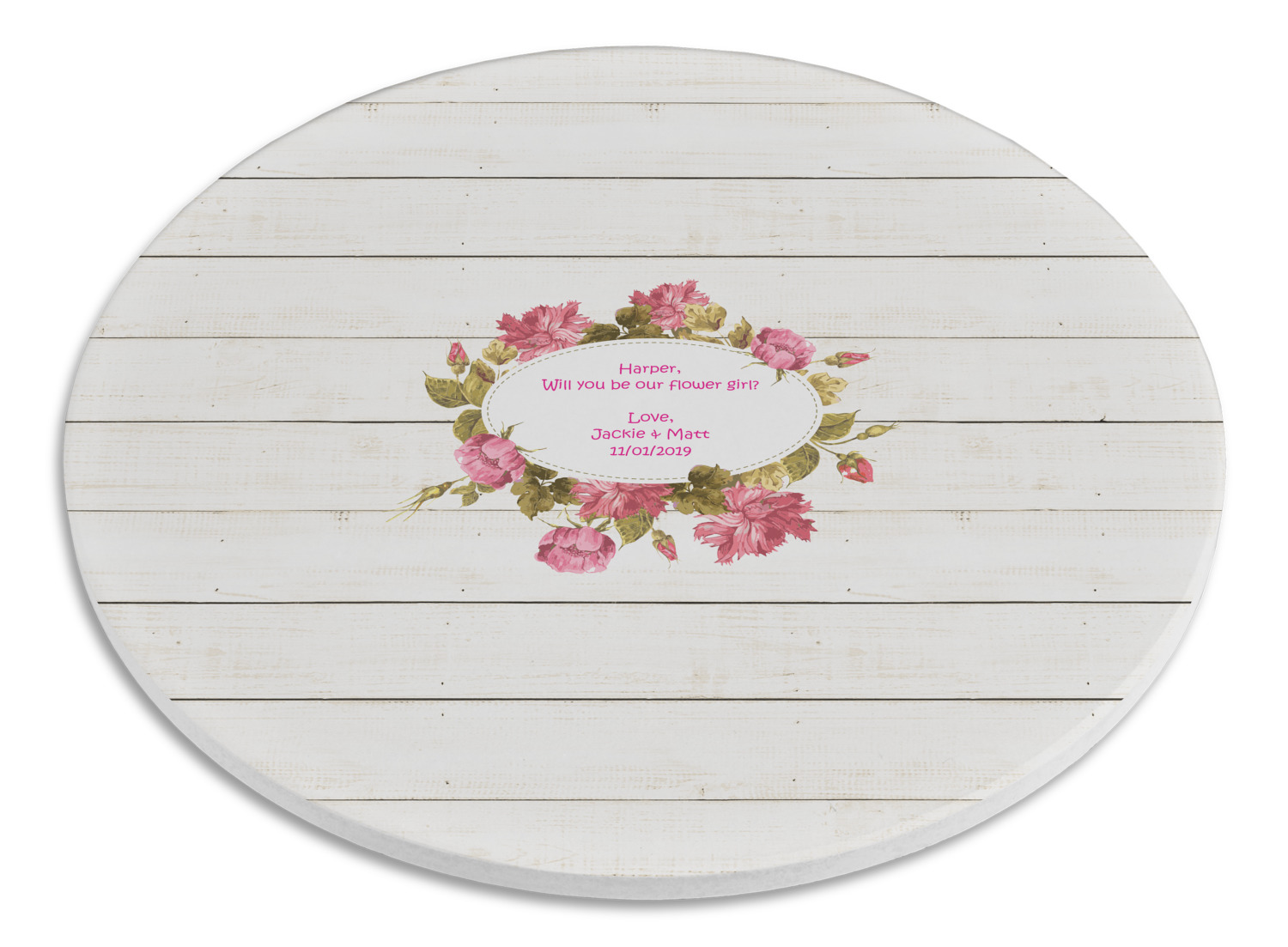 The main design has a background of weathered wooden planks. A beautiful light pink flower frame is used as the focal point of this design. The pink color of the frame and the personalization inside is the perfect contrast to the light colored wood.
