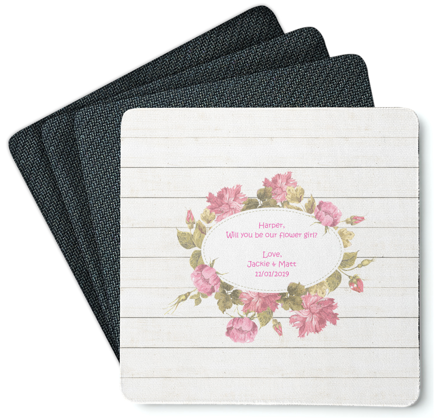 These drink coasters have a smooth, polyester top and a textured, rubber backing on its bottom. The non-slip rubber backing underneath works to keep any spills at bay. At 4 by 4 by 0.25 inches thick, these custom coasters are a suitable size for most drinkware. Your personalization is displayed atop the face of the cup coaster. We sell these rubber coasters in two different shapes: square and round. You can buy each shape as singulars or as a set of 4.