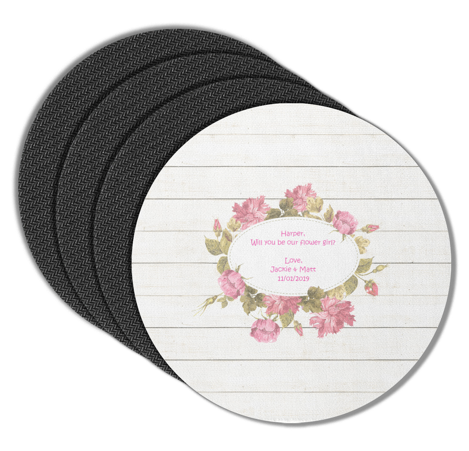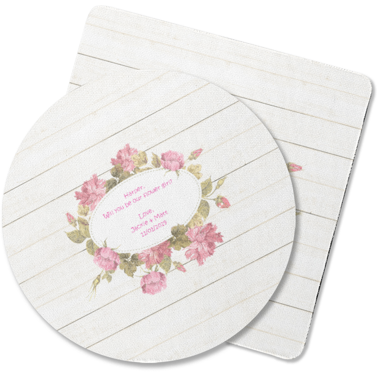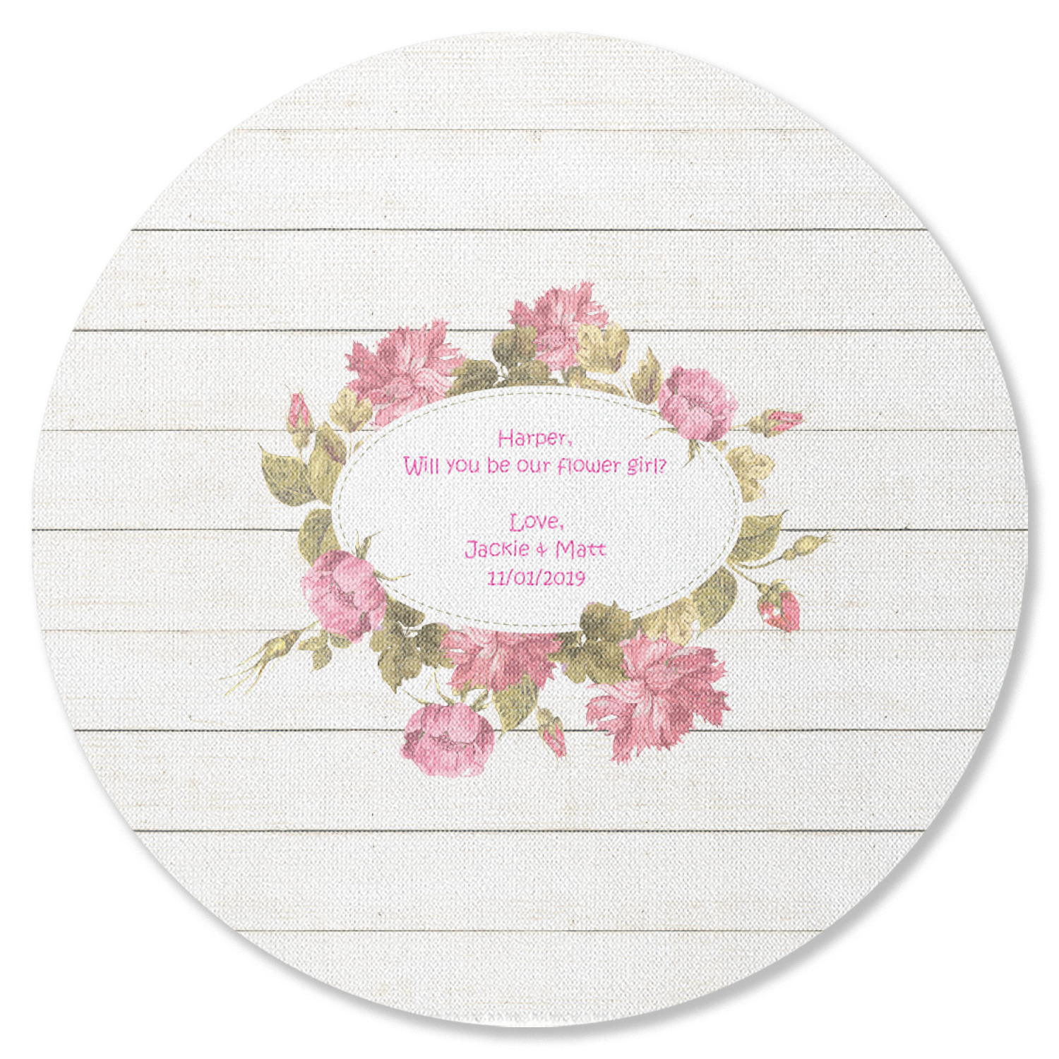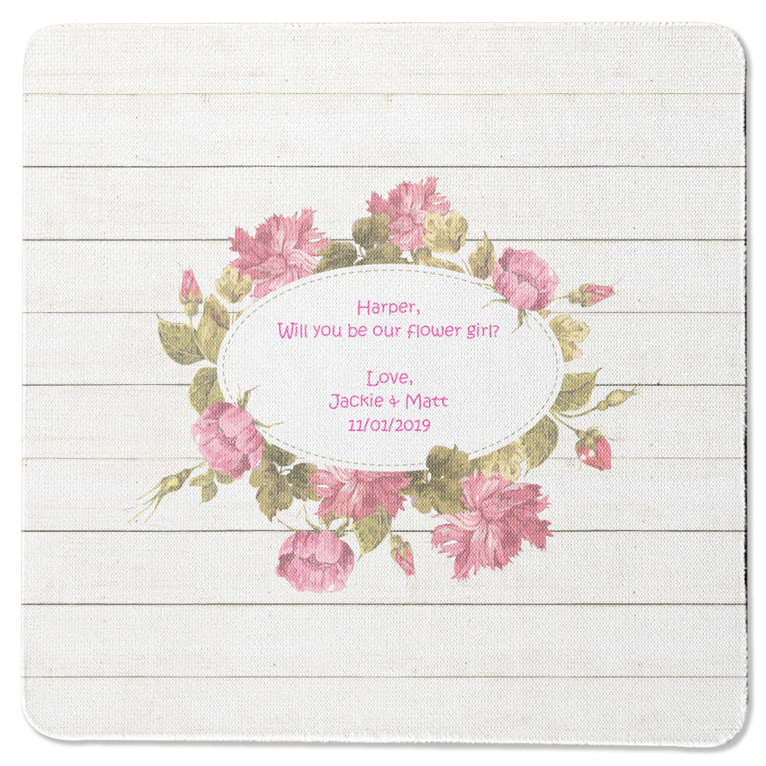 The main design has a background of weathered wooden planks. A beautiful light pink flower frame is used as the focal point of this design. The pink color of the frame and the personalization inside is the perfect contrast to the light colored wood.