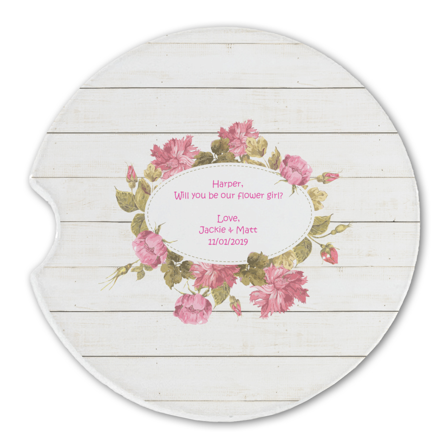 The main design has a background of weathered wooden planks. A beautiful light pink flower frame is used as the focal point of this design. The pink color of the frame and the personalization inside is the perfect contrast to the light colored wood.